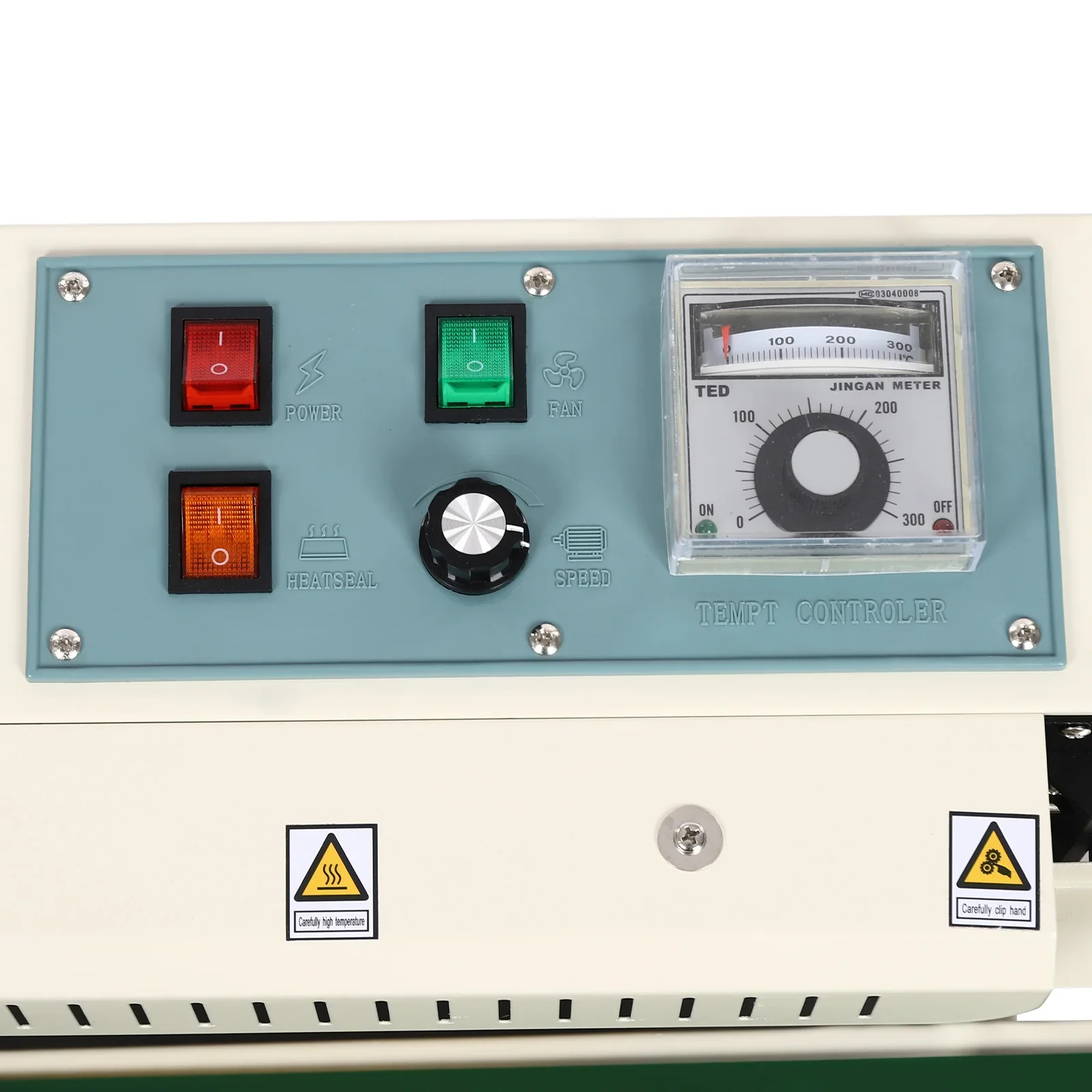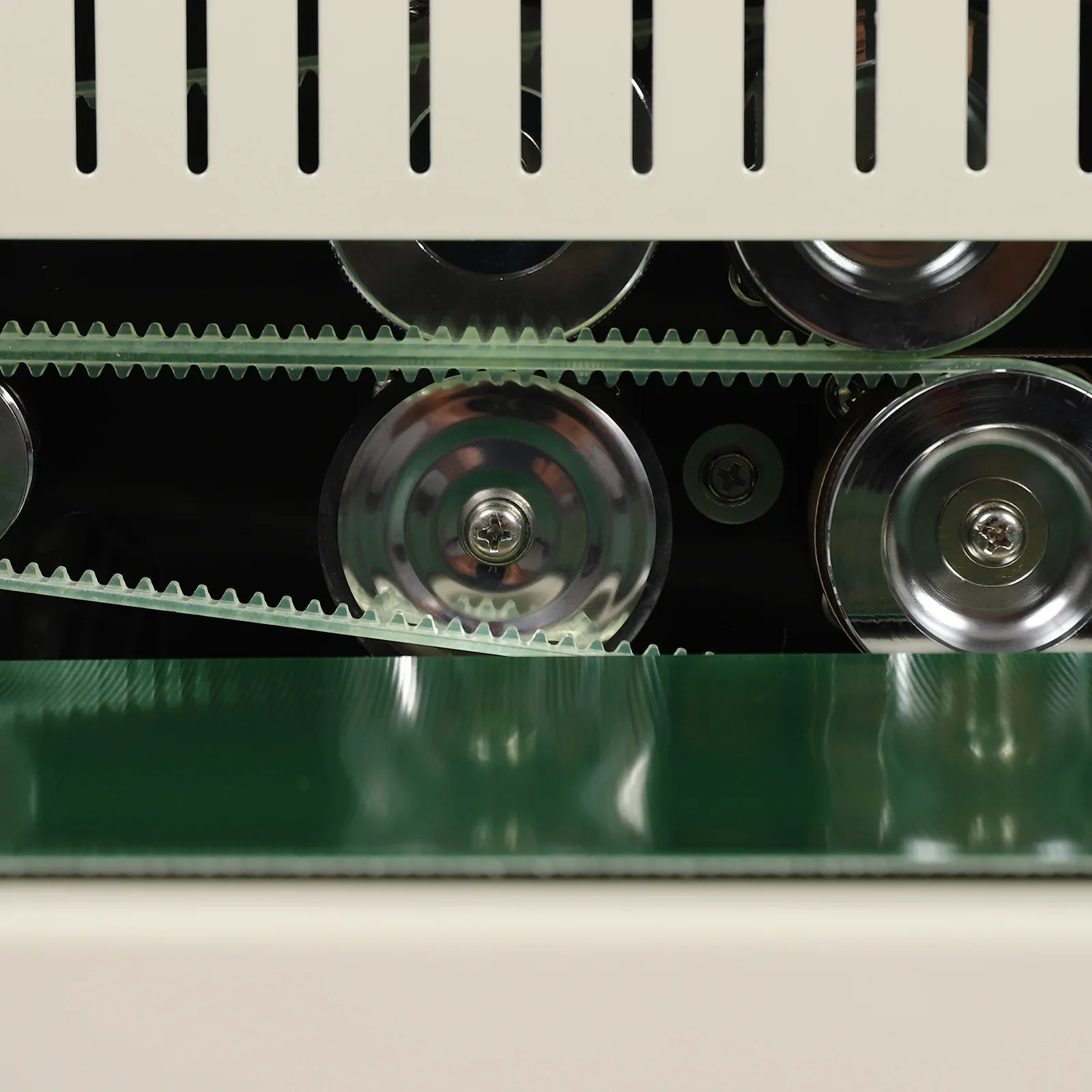 High Efficiency: The 500W high-power pure copper motor and high-quality conveyor belt give it 0-39.37ft/min sealing speed without manual transfer, which greatly improves the sealing efficiency. In addition, the pure copper heating block and cooling block have good thermal conductivity, ensuring uniform heating and faster and more secure sealing.