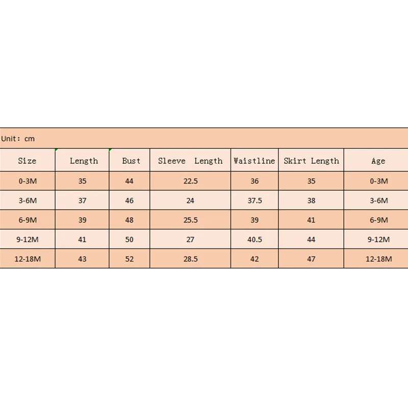 0-3M Tops Length: 13.78 Bust: 17.32 Sleeve: 8.86 Shoulder: 7.09 Skirt Length: 13.78 Waist: 14.17 Advised Age: 0-3 Months