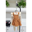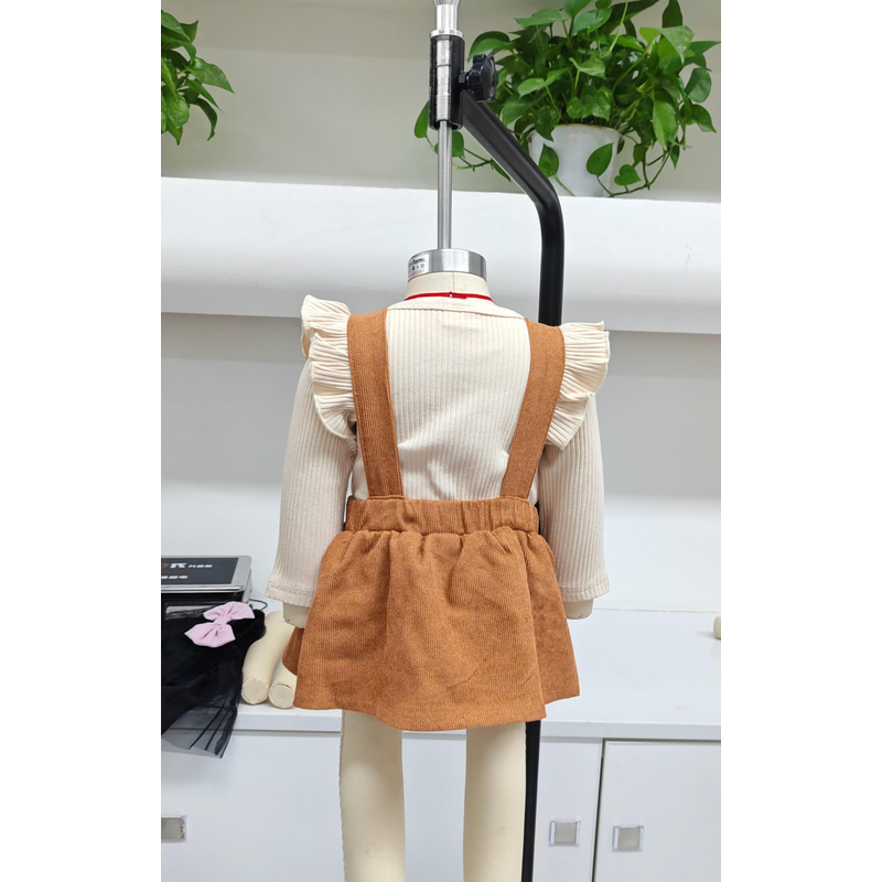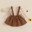 Baby Girl Fall Outfit Solid Ruffled Long Sleeve Crew Neck Romper with Corduroy Suspender Skirt 2 Pcs Set