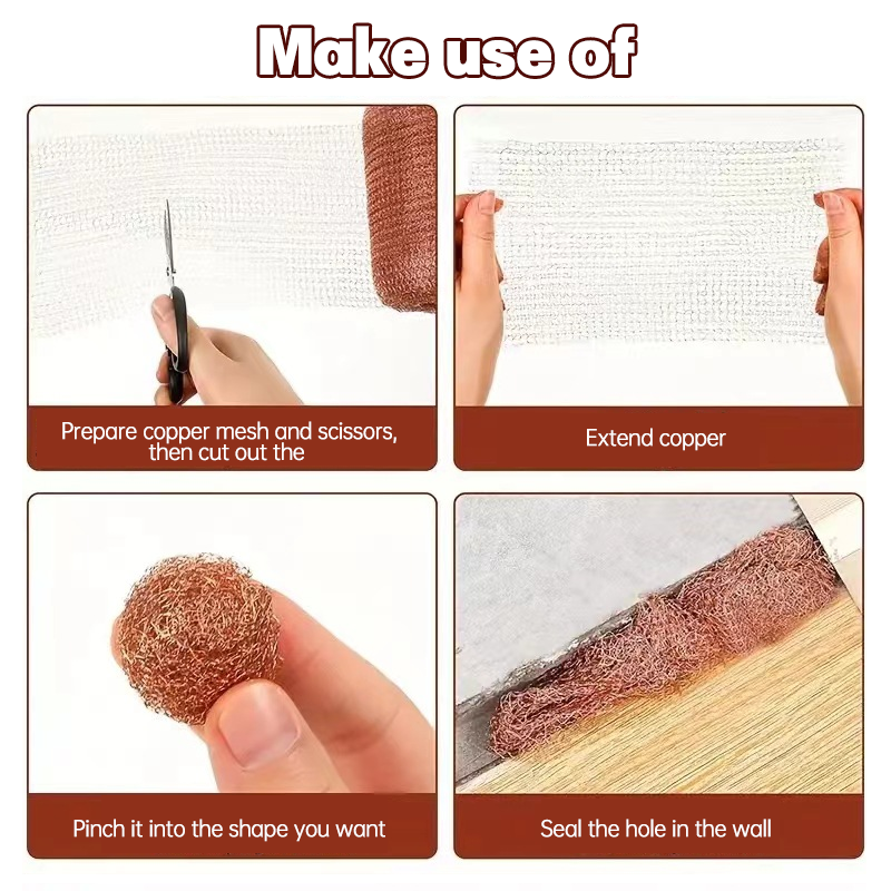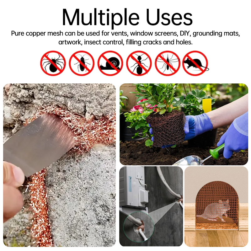 100% Copper: Our copper mesh rodent control is made not of copper alloy but of pure copper. Copper steel wool is a stiffer, stronger and more flexible material than copper alloy, which makes it impossible for rodents to burrow through or chew on this woven screen copper wool. The mouse hole filler results in effective rat repellent.