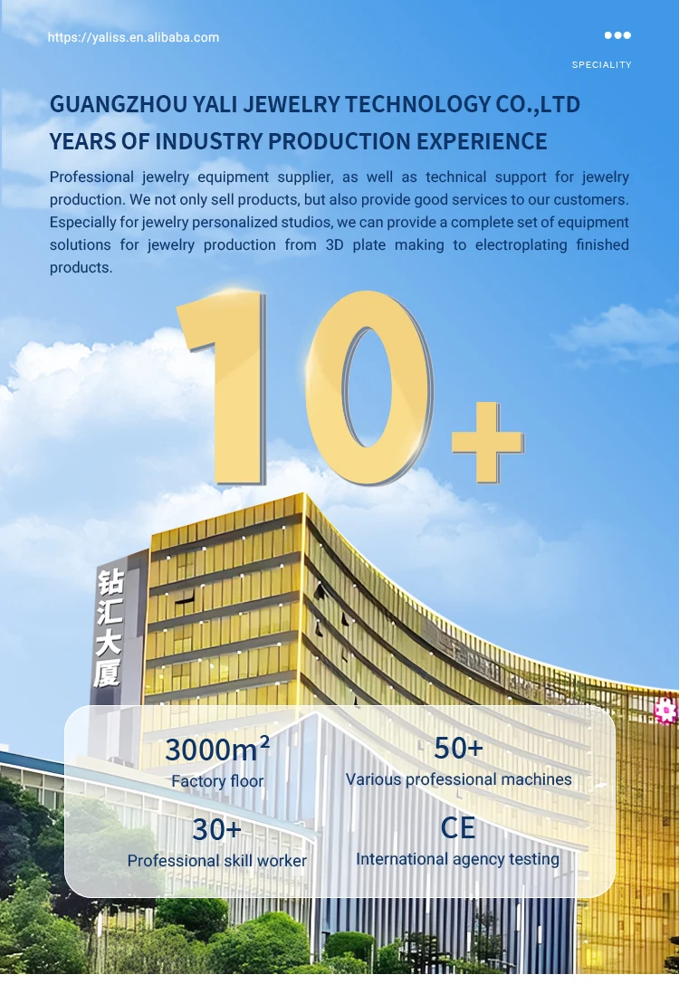 Founded in 2013,Guangzhou Yali Jewelry Technology co.,ltd,is a professional supplier of jewelry equipment,consumable,and technical support for jewelry manufacturing .We not only sell products,but also provide good technical services to our customers.We provide a completest of equipment solutions for jewelry manufacturing from 3D plate making to electroplating .