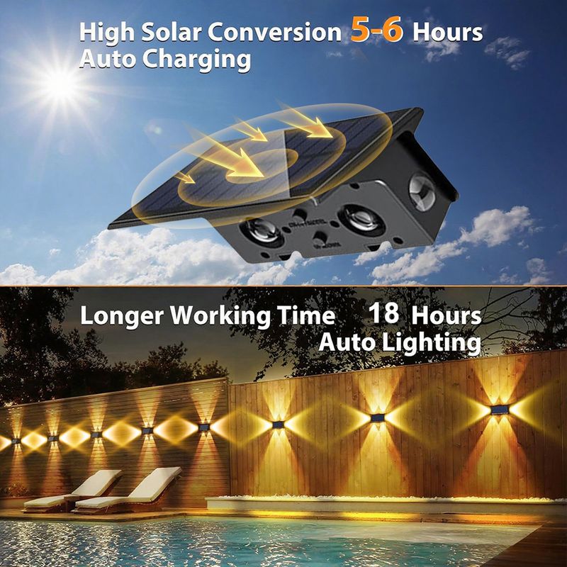 Super Brigh & Upgraded Lens LED: Each solar wall light comes with 6 LEDs that are amplified by convex lenses to concentrate the light distribution. With 100 Lumens up and down bright light from each solar wall light, you are able to see wider areas more clearly at night.Concentrating lens design to make the light brighter, which means you only need fewer solar lights to create the same or better lighting effect than other lights in the same area.