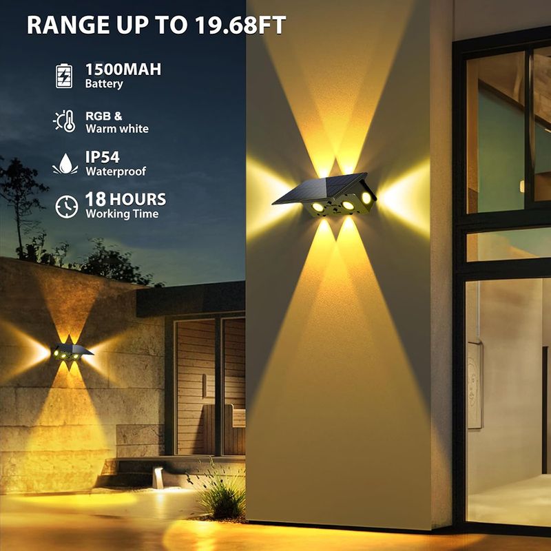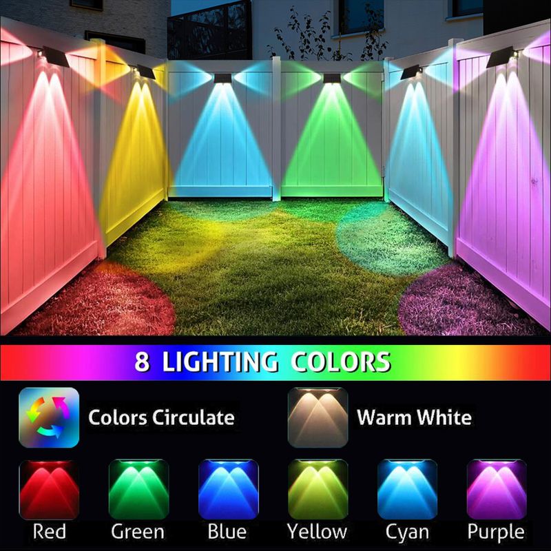 Warm White & RGB Wall Solar Lights: Solar Wall lights outdoor make your house brighter than before. Press the ONOFF switch to cycle through light settings to choose your favorite one.The solar Wall light offers 8 steady light modes (warm white, red, green, blueyellow, cyan, purple) and RBG breathing light mode. The up-down mode can be used on open and high courtyard walls. Breathing RGB and Warm White mode is perfect for creating a romantic atmosphere and is a great choice for patio poolside stair decor at wall, parties, festivals, holidays.