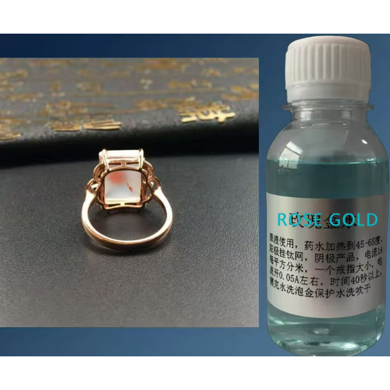 Function:Rose gold electroplating water should be used together with electroplating machine + titanium mesh, after stainless steel base, plating rose gold, rose gold is easy to turn dark, pay attention to the adjustment of voltage/current/electroplating time, observe at all times.