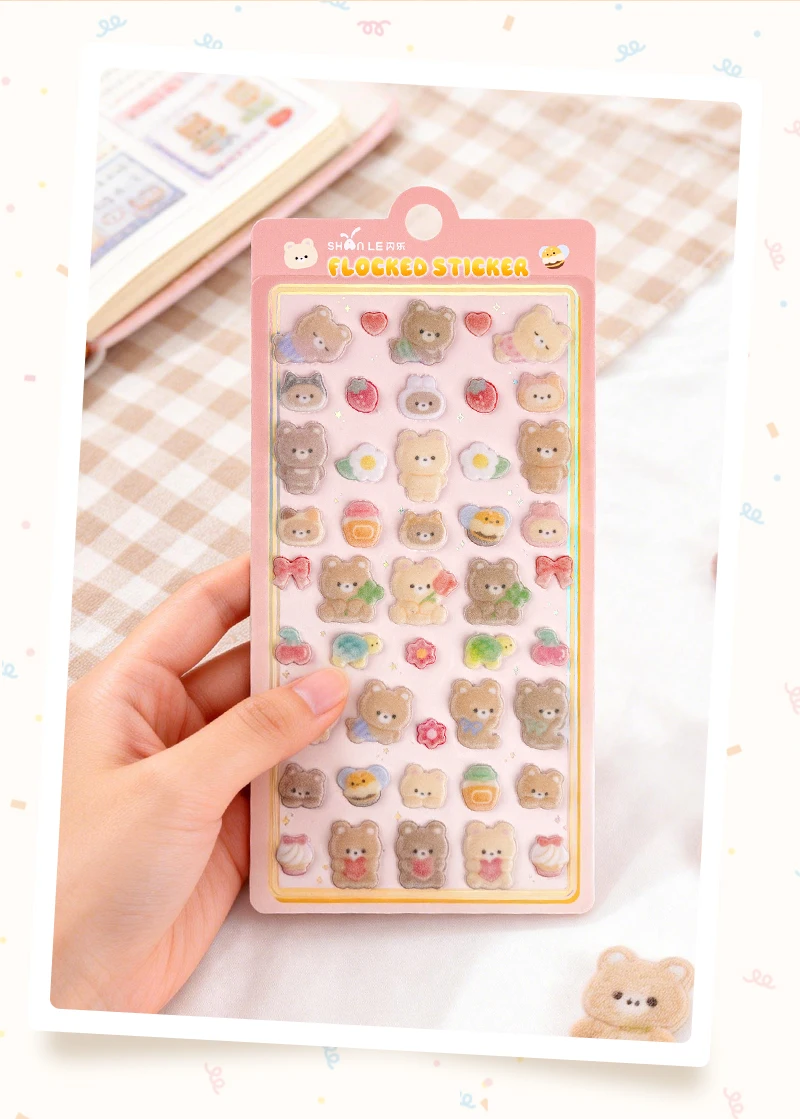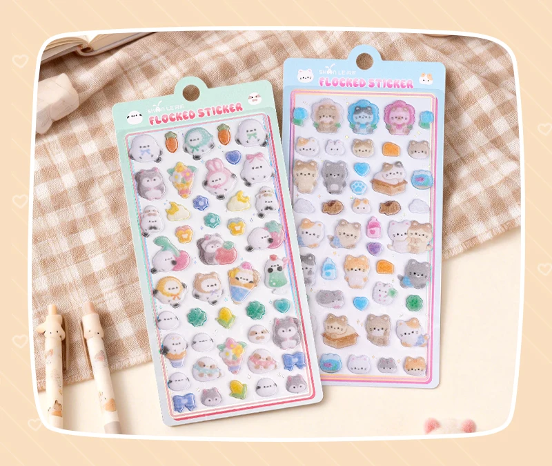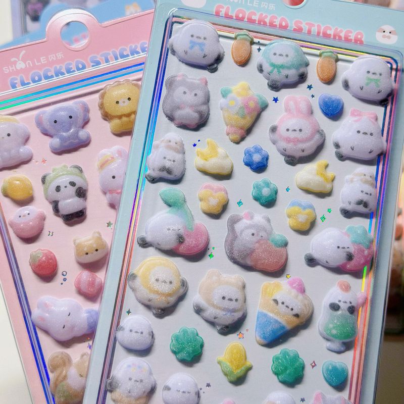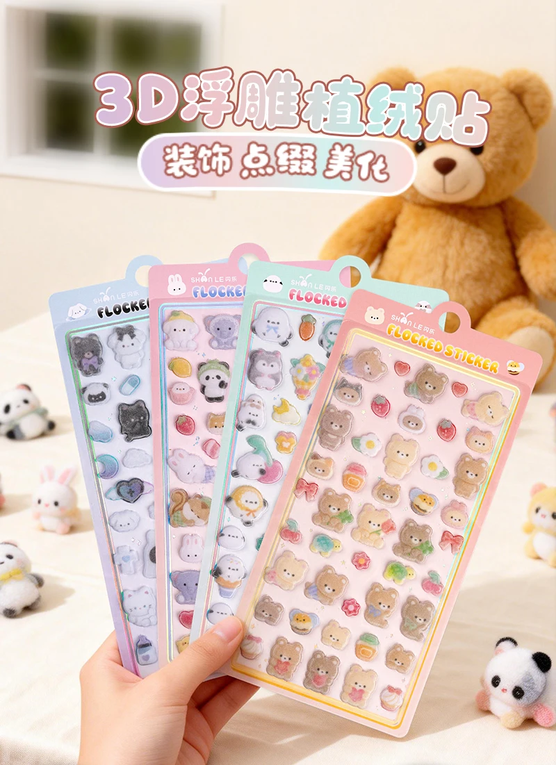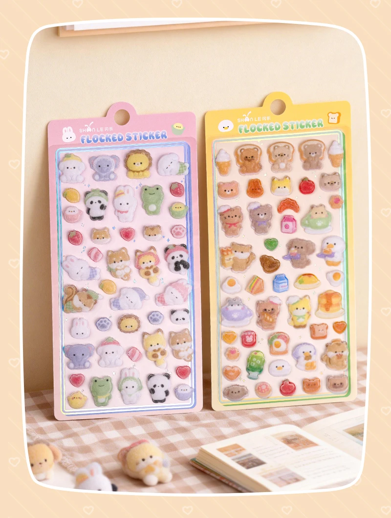 1 pc/6 pcs Cartoon Animals Flocked 3D Relief Stickers Journaling DIY Diary Cute Stationery Sticker Decor School Supplies
