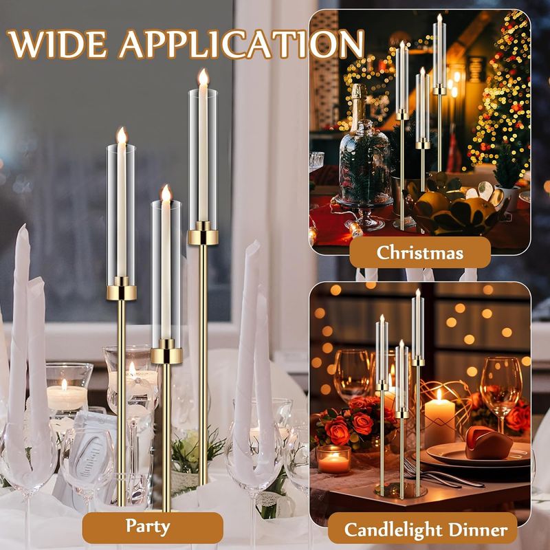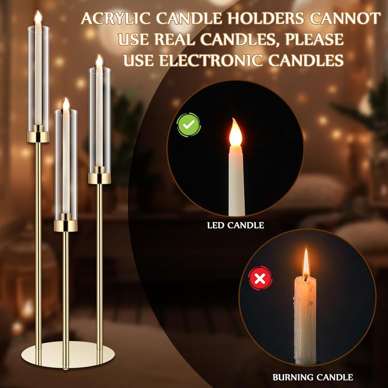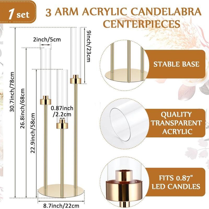 Acrylic Candle Holders: you will receive 6 sets of 30.7" gold 3 metal arm acrylic candelabra centerpieces with shades; The height of the candlestick is 30.7 inches, 26.8 inches and 22.9 inches ( includes base) , suitable for electric candles with a diameter of 0.87 inches, the round base is 8.7 inches in diameter, and the height of each cylindrical lampshade is 9 inches; Note: please use electric candles and the set does not include candles