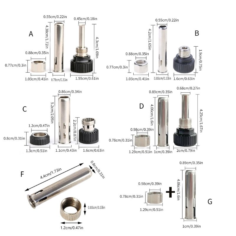 Set Types: 936 Sleeve 3Pcs Set, 203 Sleeve 3Pcs Set, 05 Sleeve 3Pcs Set, 100w Matchings Soldering Iron Sleeve 3Pcs Set, Yellow Flower 907 Sleeve with Nut, 936 SteelPipe with Nut, 100w Matchings Screw with Sleeve(optional)