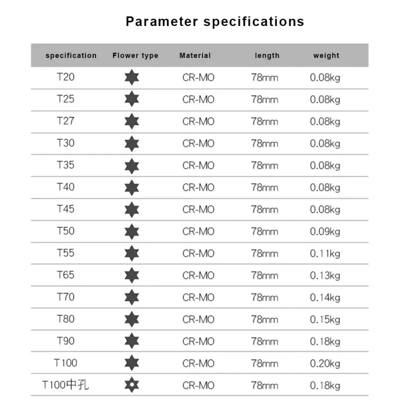Size:T20-T100 (optional)