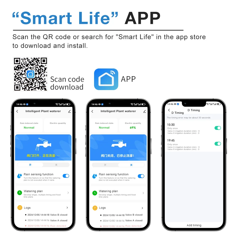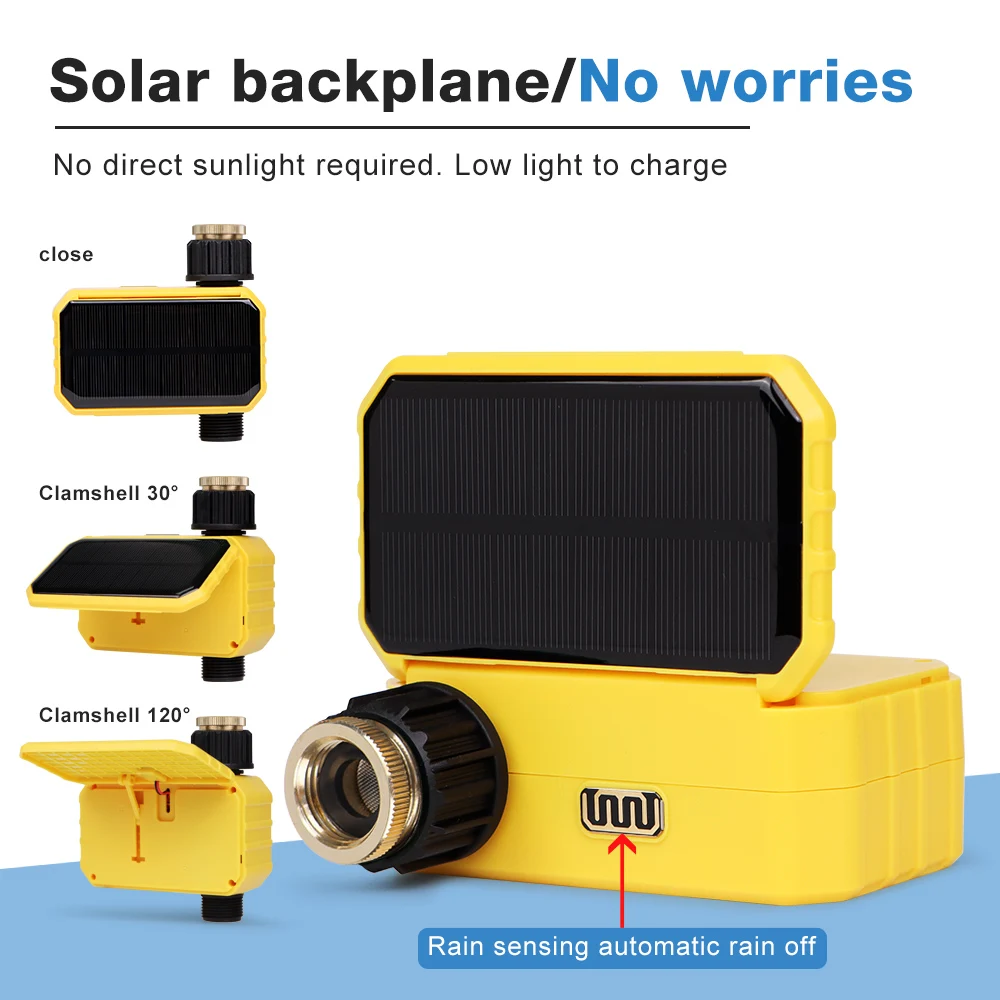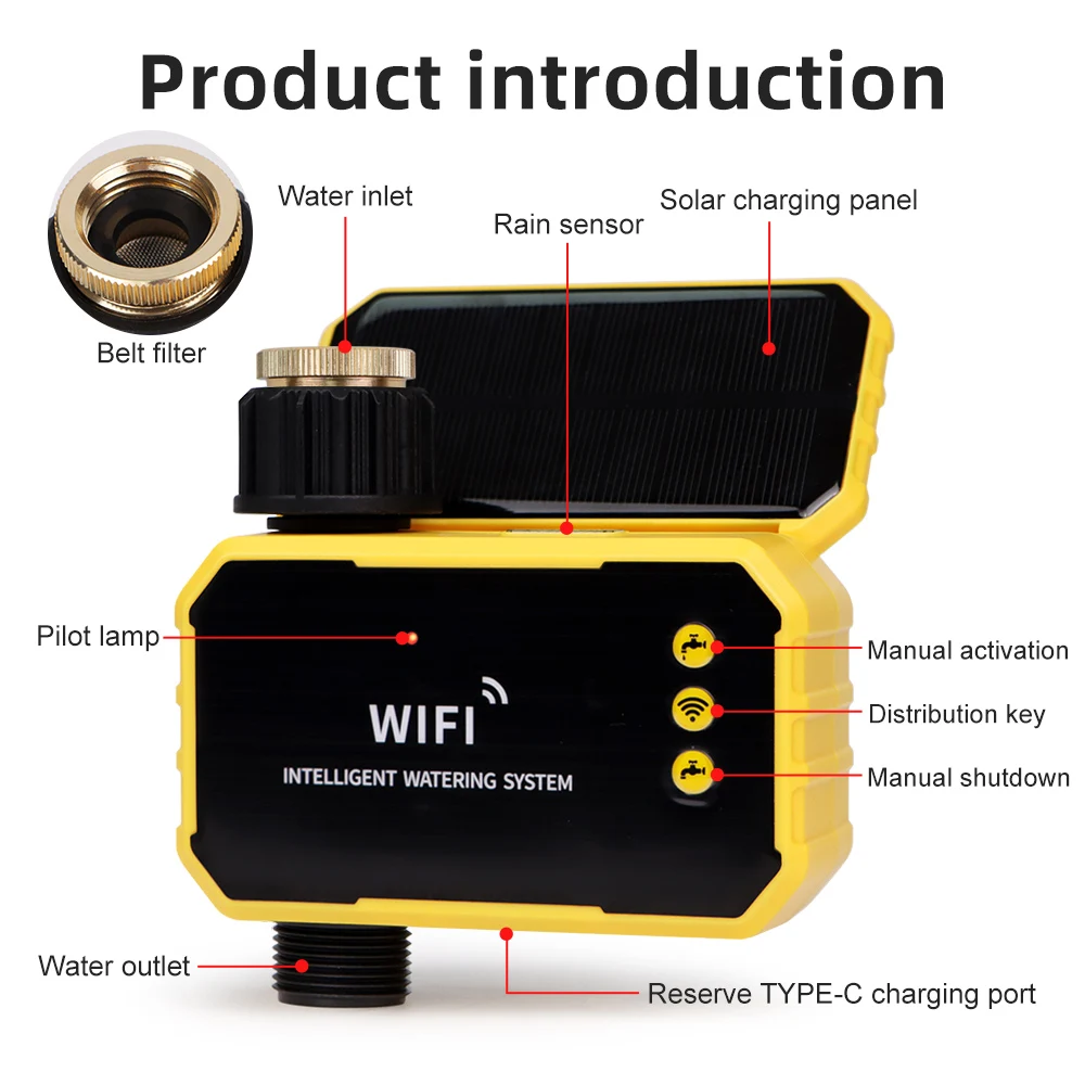 This product is an intelligent water valve controller product that uses photovoltaic charging. it isrecommended to work in the sunlight and is equipped with a Type-C charging port, which can also meet the indoor use environment without sunlight.This product is suitable for villa courtyard, balcony garden, roof garden, family green wallthree-dimensional greening micro spray, site engineering dust removal, vegetable garden dripirrigation, spray irrigation. This product meets the waterproof level 5, can resist rainstorm, butcannot soak in water. The shell is made of UV resistant material, allowing sunlight exposure.