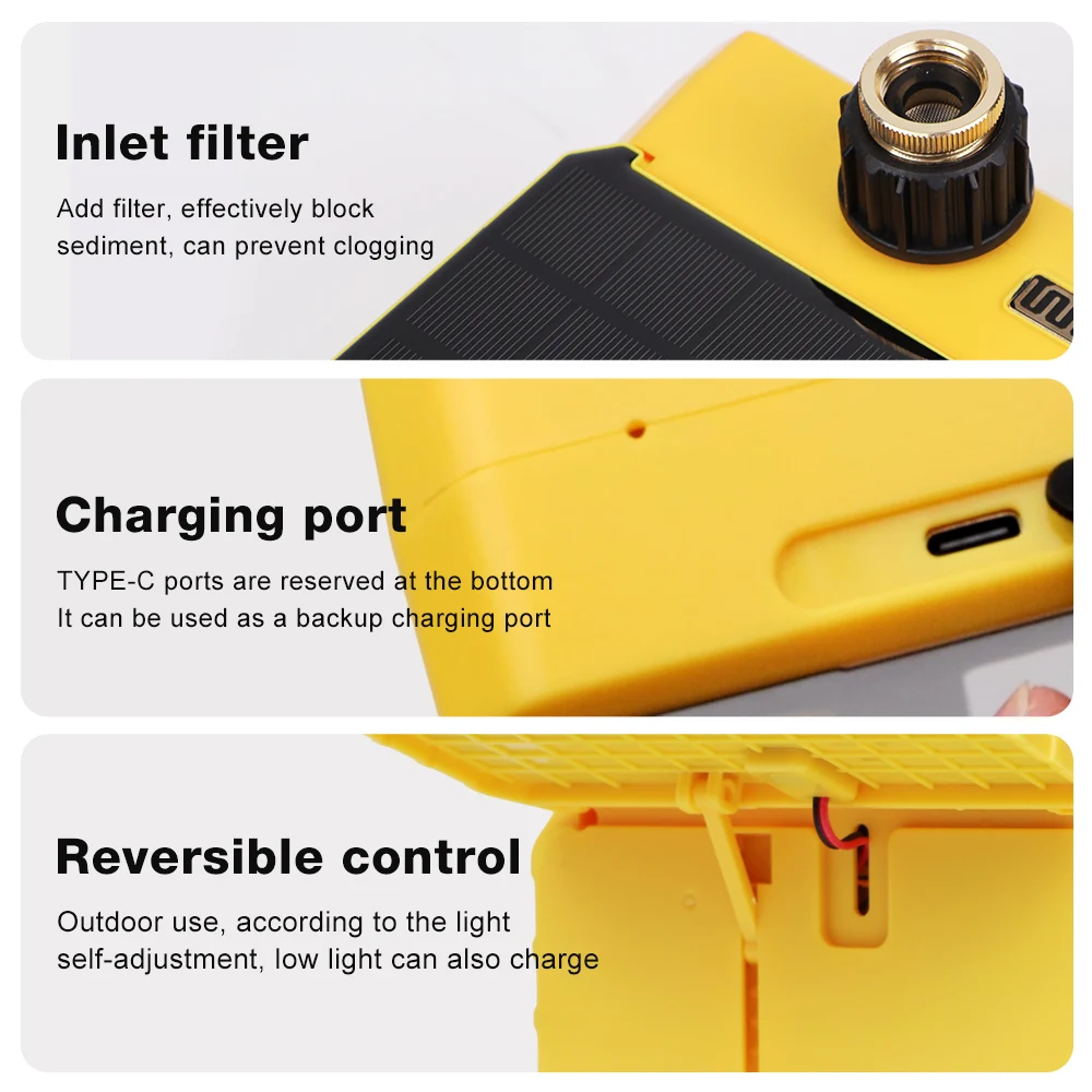 1. Solar Powered: Equipped with high-performance solar panels, it doesn't need direct sunlight, and it can charge the built-in battery on cloudy days and low-light days, no power anxiety at all, perfectly capable of daily irrigation tasks. Equipped with Type C spare charging port at the bottom.