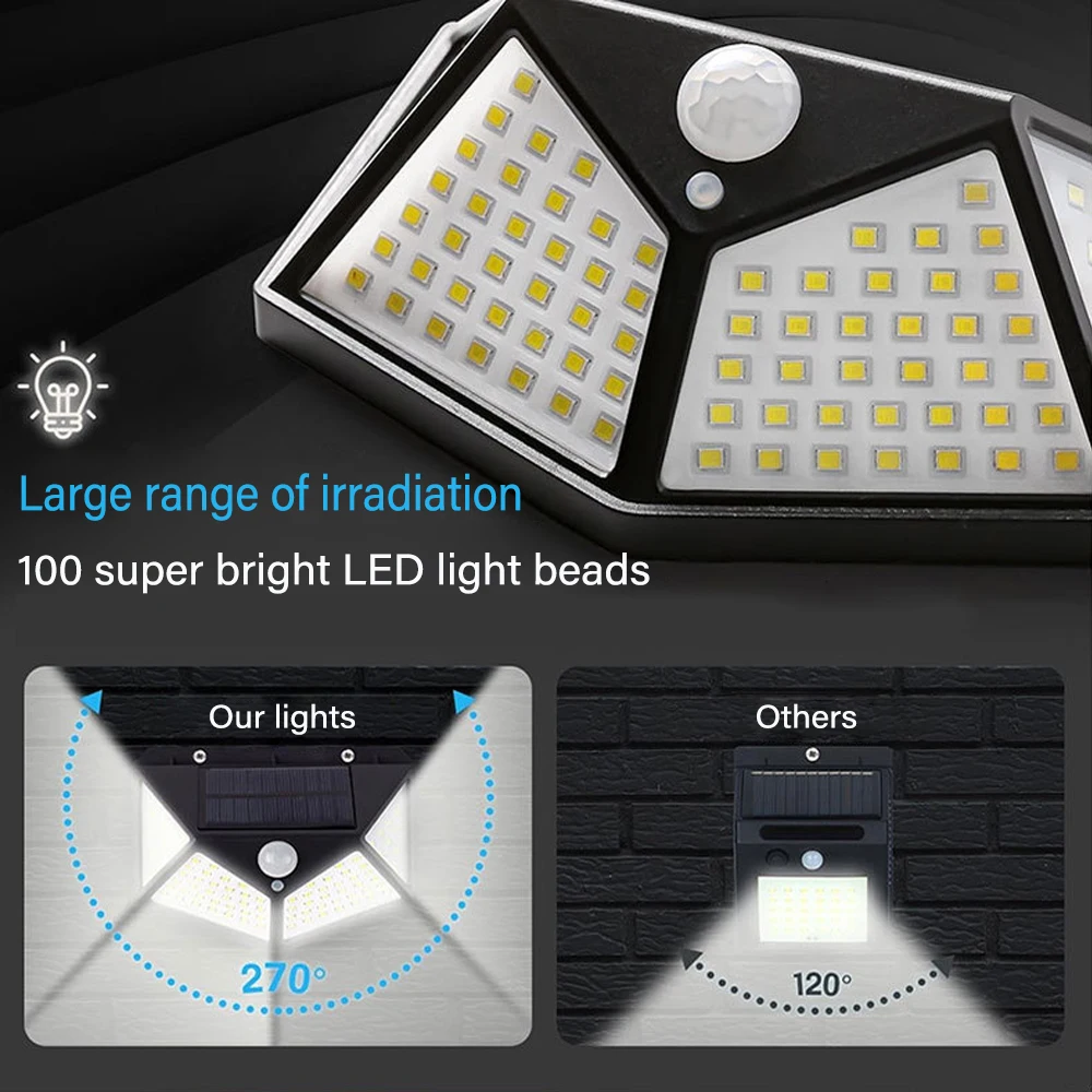 1.【The brighter brightness with 100 LEDs. Our outdoor solar motion sensor lights come with 100 LED sources to provide a brighter, more powerful lighting solution that will illuminate an area immediately and keep it brighter.