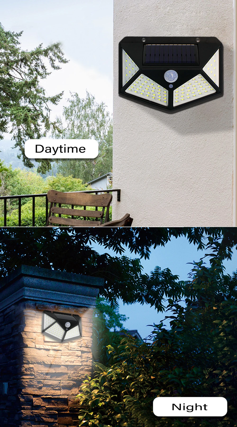 6.【Waterproof IP65 and heat resistant】100 LED solar motion sensor light is perfect for walls, terraces, gardens, porches, lawns, paths, driveways, ditches, etc. It is specially designed to withstand extreme weather conditions.