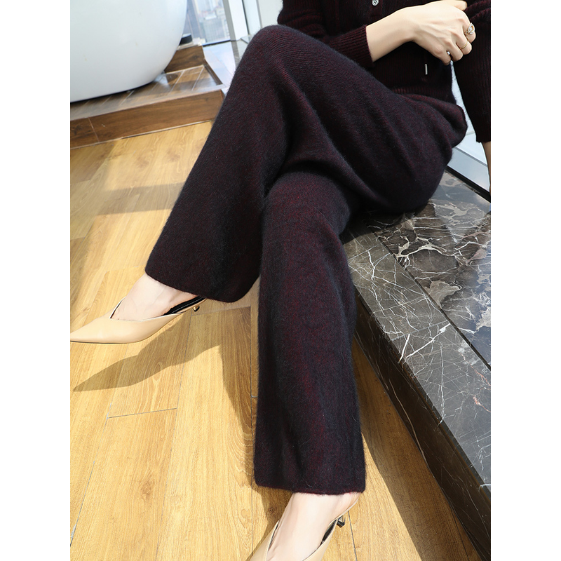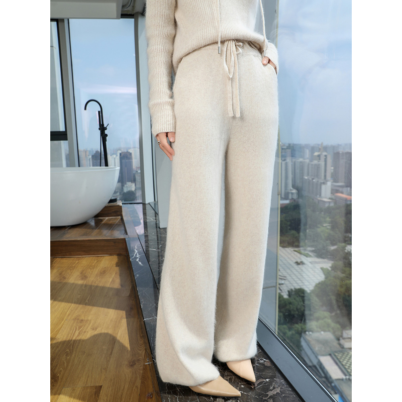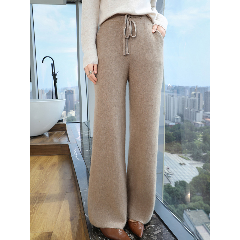 100% Pure Mink Cashmere Knitted Wide-Leg Pants Women Lace-up Elastic High-Waisted Trousers Casual Loose Mop Pants Thick Leggings