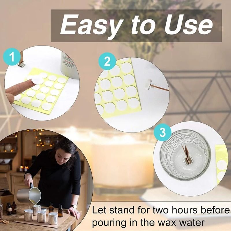 The glue dots for candle making are made of heat-resistant adhesive, which are quality round double sided foam type stickers. Good adhesion and heat resistant, which can keep your wicks in place in hot wax.