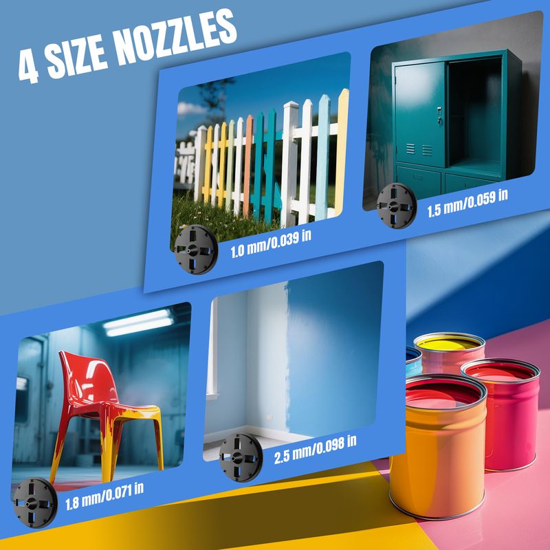 【3 Spraying Modes】The spray gun can be set to 3 different spraying modes: 1.5mm/2.5mm/3mm nozzle, circular 45°, horizontal 90°, vertical 180°, vertical surface is horizontal mode, horizontal surface is vertical mode, no need to open the container Add paint directly.