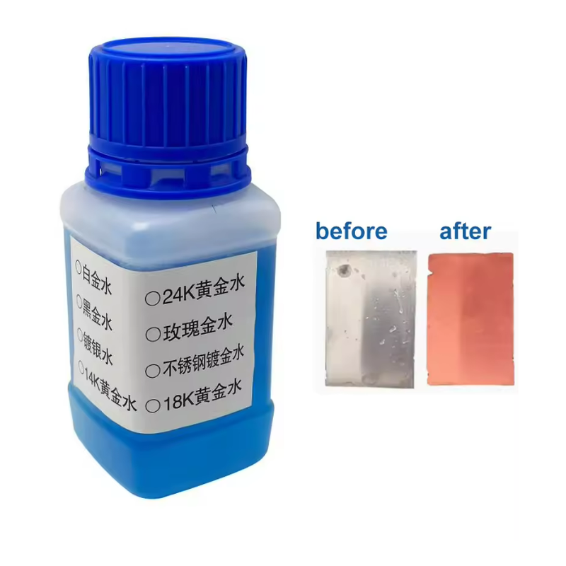 Function:24K gold electroplating water, need to be used together with electroplating machine + titanium mesh, can be used after stainless steel base another layer of 24K yellow is plated, and the color is bright.
