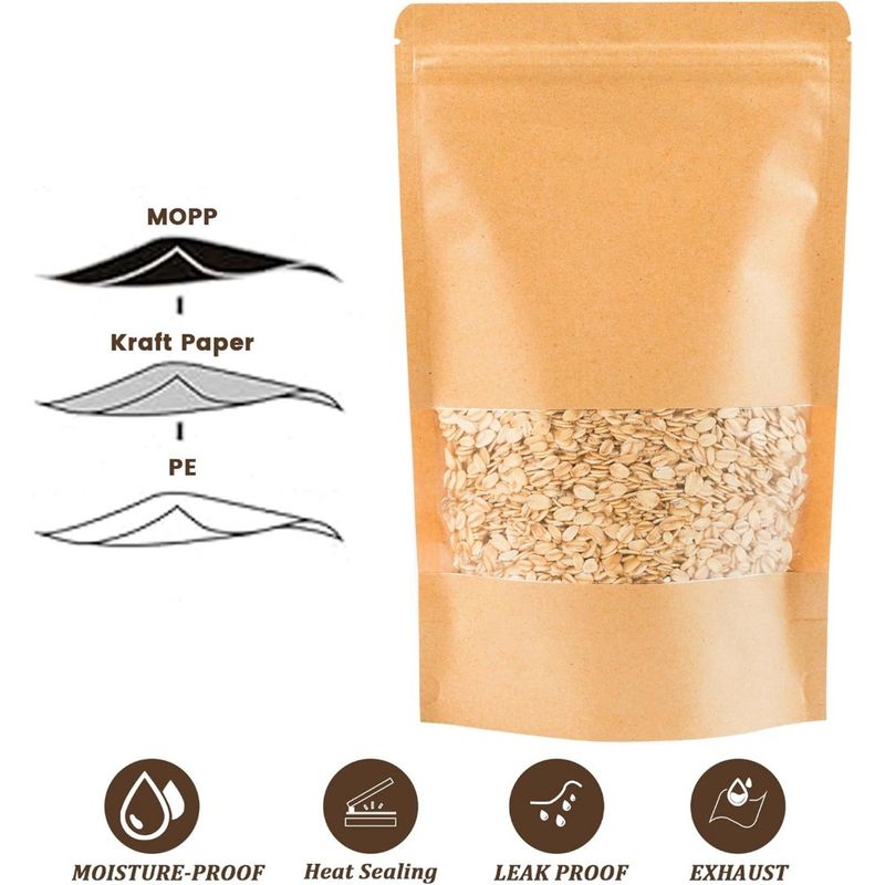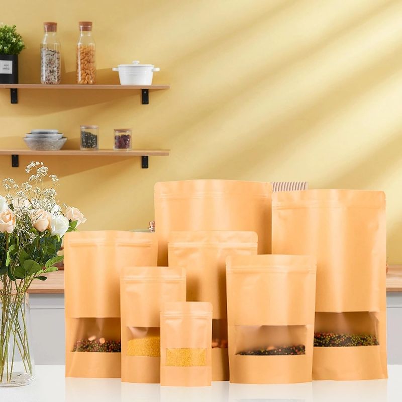 100PCS Kraft Paper Bags with Window, Resealable Paper Bags for Food Storage, Stand Up Paper Bag for Small Business