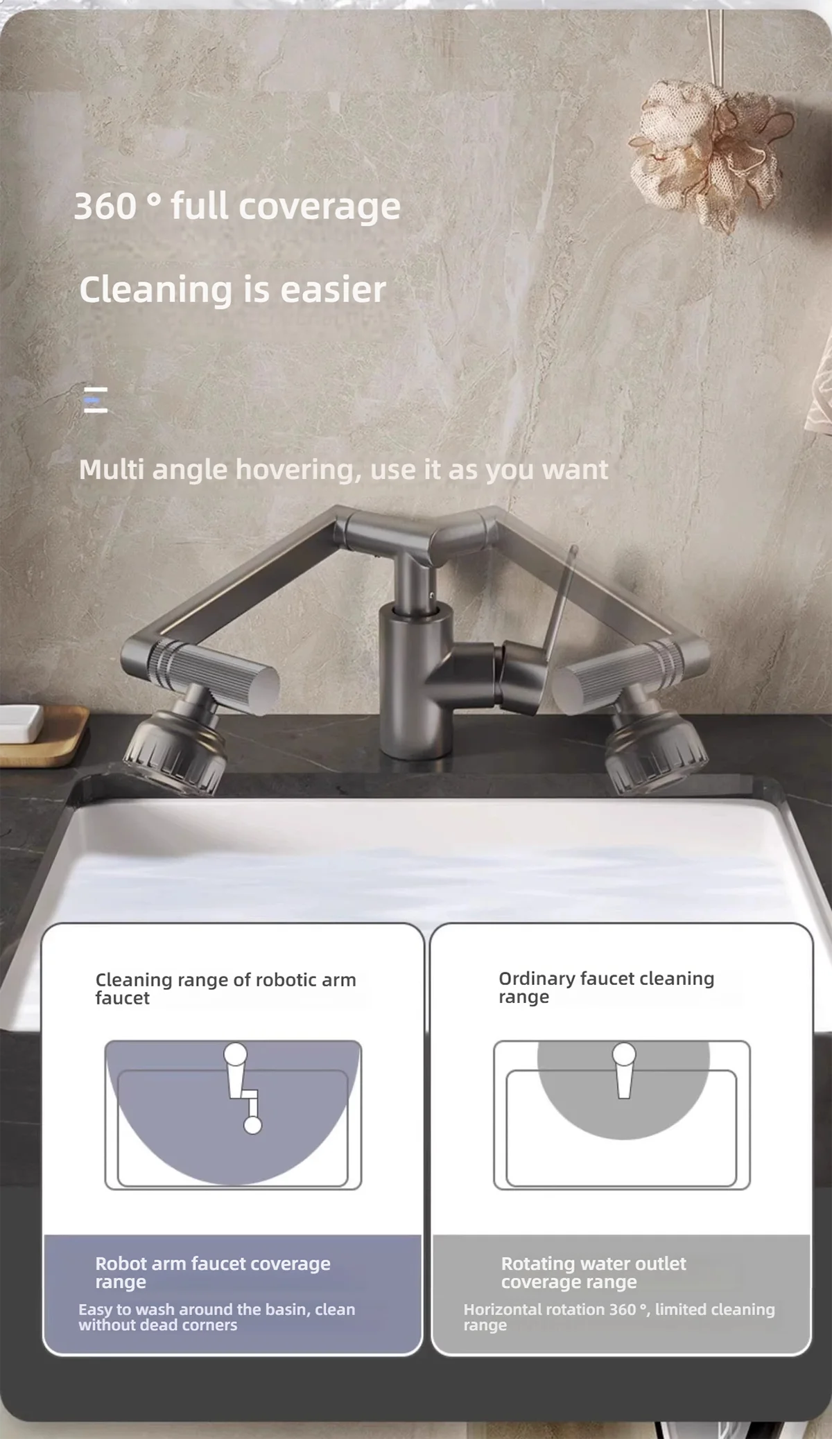 • Flexible Rotation: It has a 360° or 1080° universal rotation function, allowing for multi - angle free hovering both horizontally and vertically. Its coverage area far exceeds that of ordinary faucets, enabling thorough cleaning of the sink without blind spots and providing convenient and free - will use in daily life.