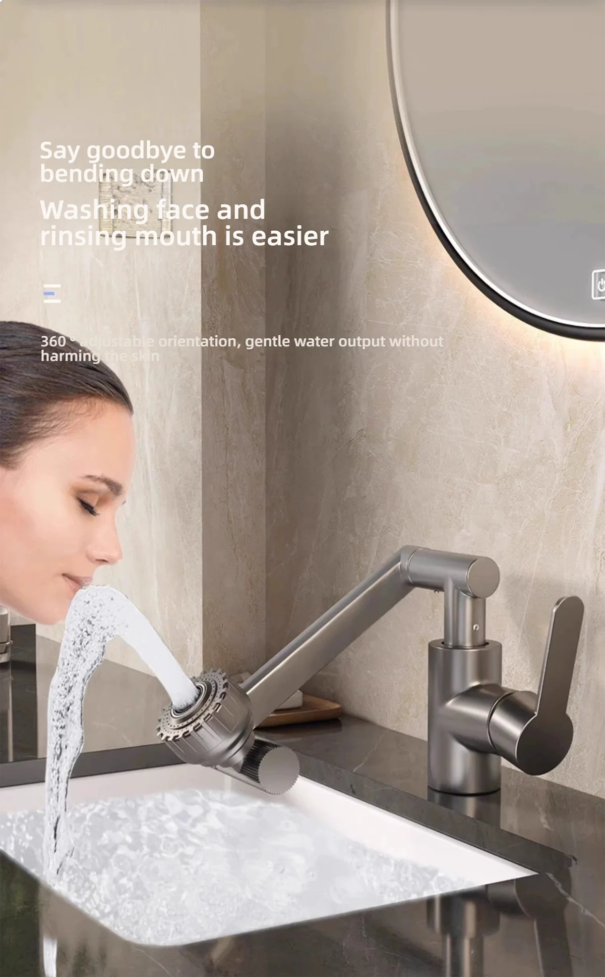 It is applicable to kitchens and bathrooms. It can easily handle scenarios such as washing vegetables and dishes in the kitchen, as well as washing faces, rinsing mouths, and washing hair in the bathroom.