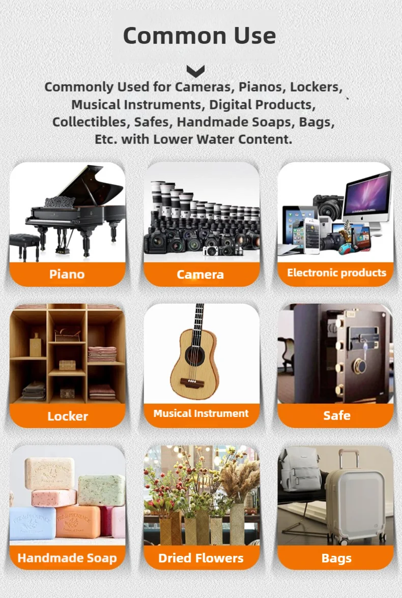 Helps lower the humidity within sealed spacesReusable, can be easily reactivated by heating in an ovenUsed in clothes, instruments, jewelry, cameras, cosmetics, books, electronics, etc.