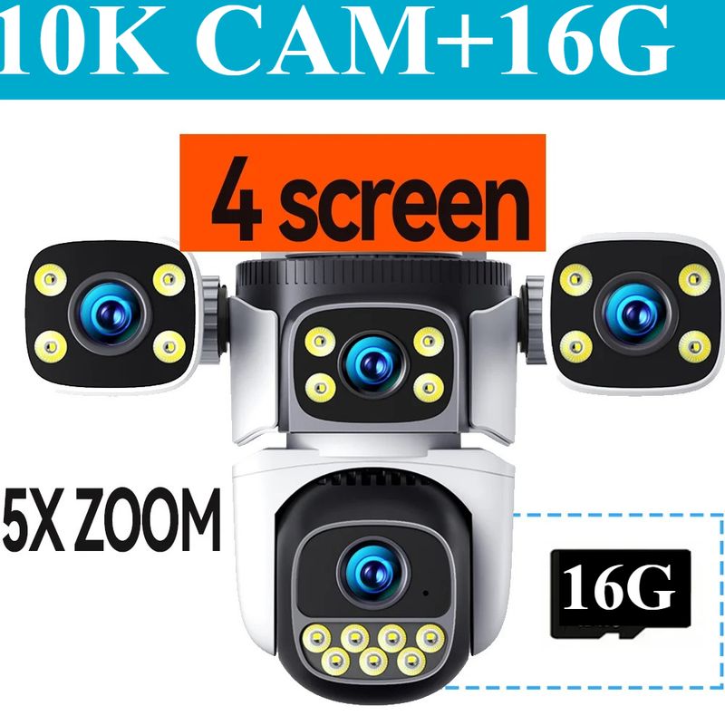 10K Home Security WiFi Camera Four Lens Four Screen PTZ 360° 5x zoom CCTV Auto Tracking 20MP Wireless Surveillance IP Cam