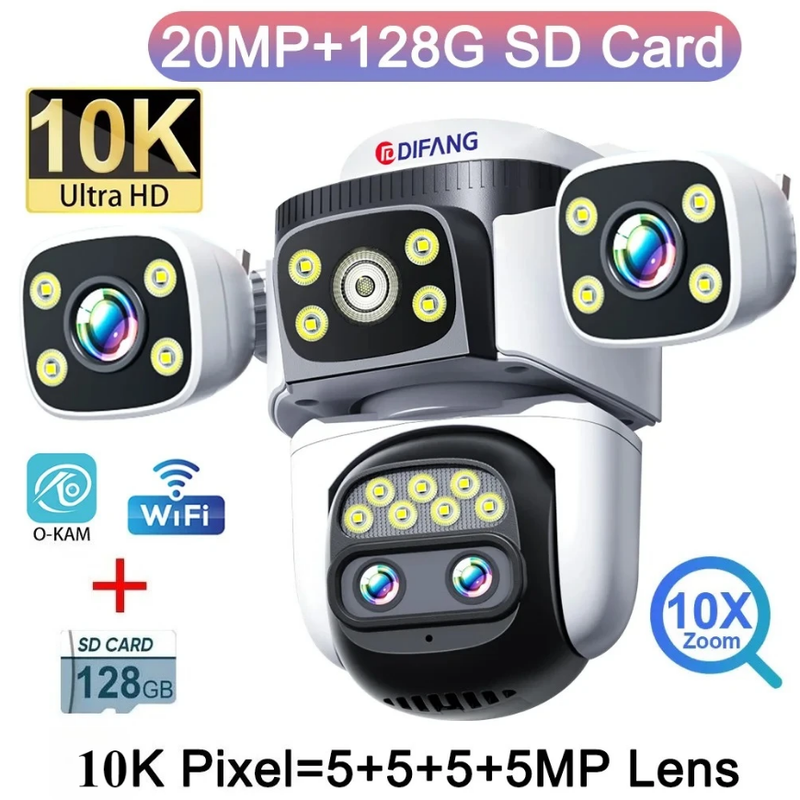 10K WiFi Camera 20MP Wireless Outdoor 10X Zoom Three Screen Four Lens 720° PTZ Automatic Tracking Waterproof Security Camera CCTV
