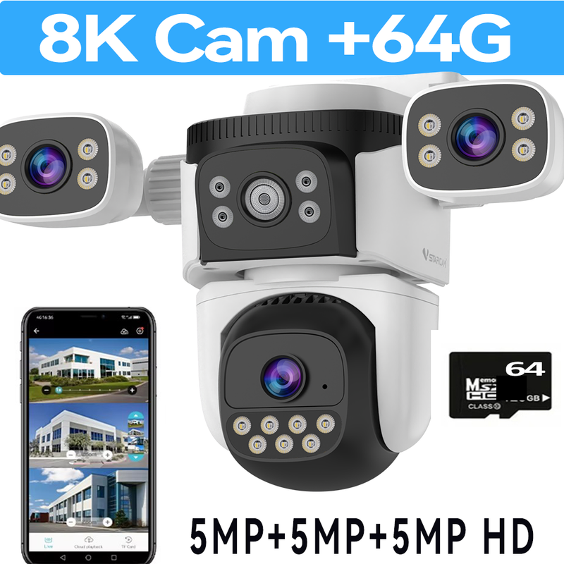 8K Resolution: Pixels of each lens are 5MP, 5MP Lens+5MP Lens+5MP Lens = 8K