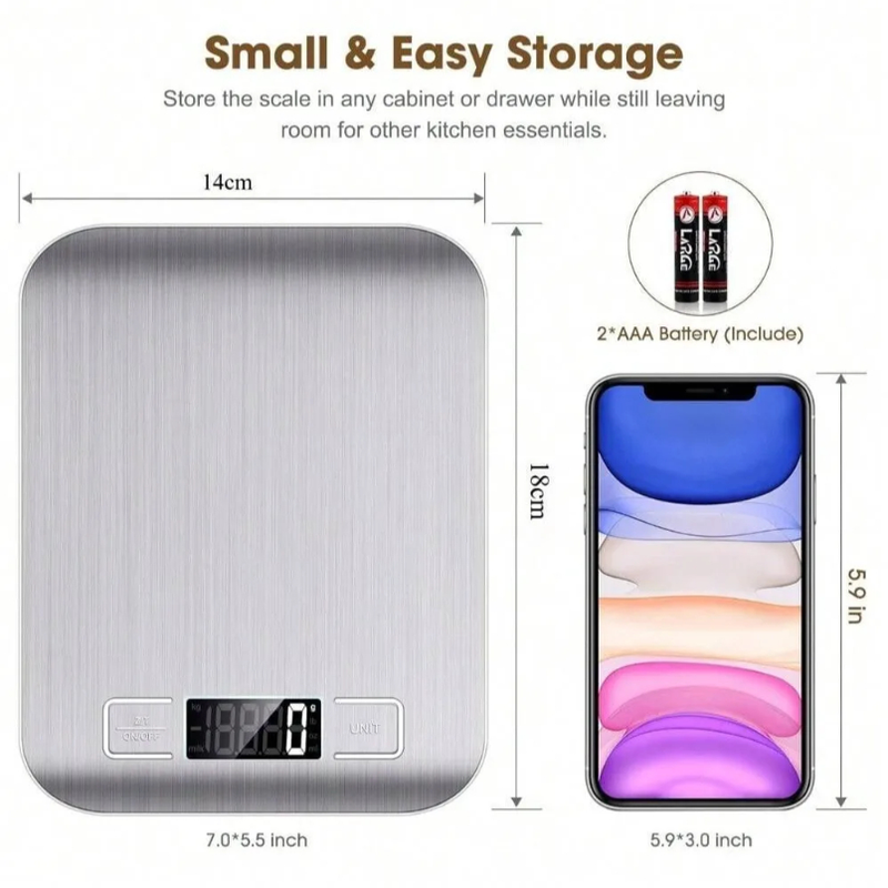 [SIMPLE BUT NOT SIMPLE]--The exquisite and compact kitchen food scale is made of high-quality stainless steel. Compared with food scales on the market, it is more waterproof and wear-resistant, and can easily wipe off any stains on the surface to keep it clean and maintained. In order to prevent edge collisions, we adopt a rounded corner design and four anti-slip bases, which increase safety and stability and bring you a more convenient lifestyle.