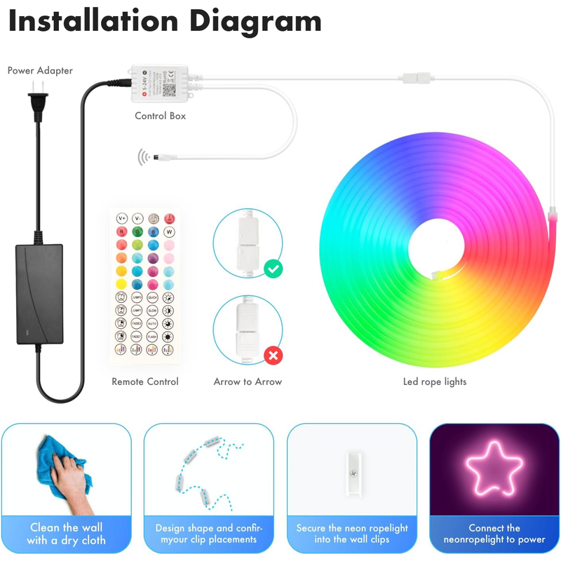 4.Waterproof and Safe: Our neon strip light bar is not only suitable for indoor use, but also perfect for outdoor lighting with IP67 waterproof rating, which ensures long-term stable operation in outdoor environment. The neon LED strips are powered by 24V low voltage, which reduces the level of danger. Whether you want to create a unique party atmosphere or just want to add a splash of color to your home garden, our light strips are the perfect choice. (power supply/Controller is not waterproof)