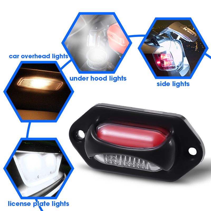 Super bright LED License Plate Light, provide maximum visibility and safety. Can be used as license plate light, step light, door light, side marker light, etc. Fits for motorcycles, boats, cars, trucks, trailers, RV's, Van, Pickup, lorry, etc. Waterproof design, no worry about rainy days.