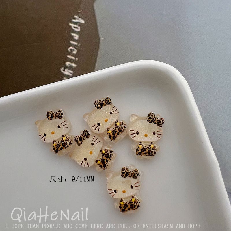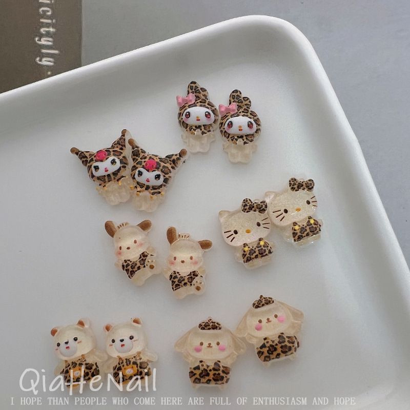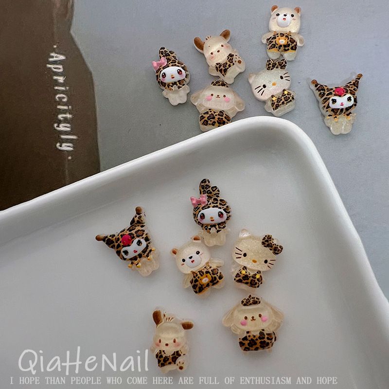 10pcs Leopard Maillard Print Pattern Hello Kitty Melody Kuromi Cartoon Nail Accessories Cute Mini Resin Manicure Trinket