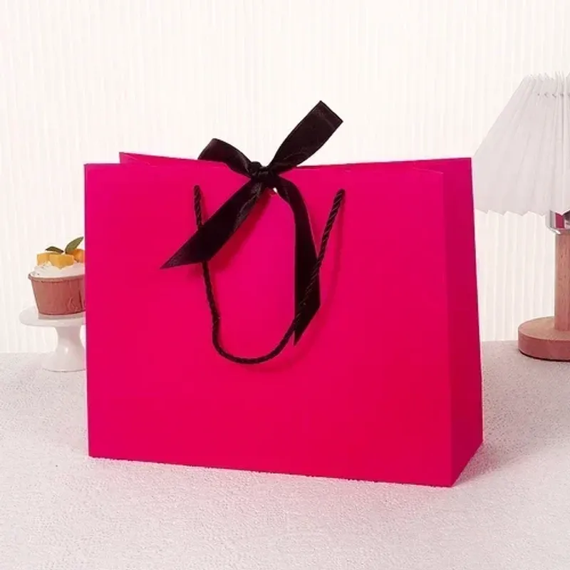 10pcs/lot High Quality Pretty Pink Gift Bag Gift Box Ornament Pajama Book Black Handle With Ribbon Paper Box Bag Kraft Packaging
