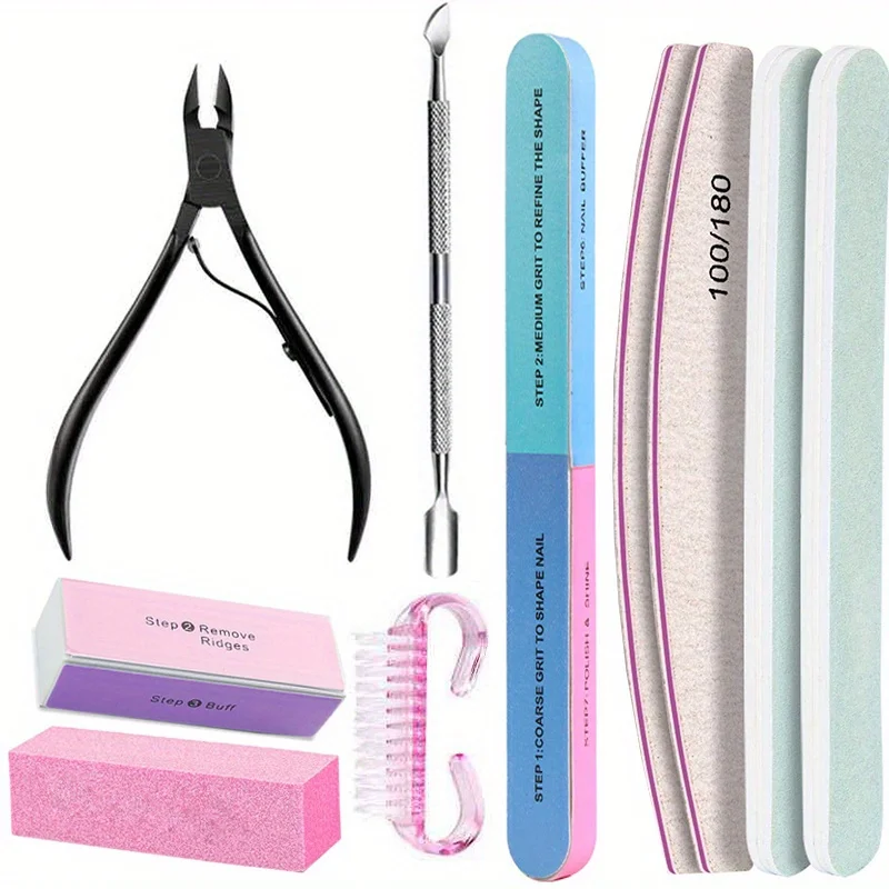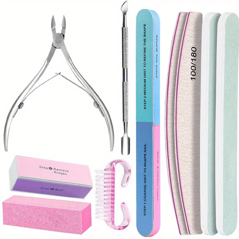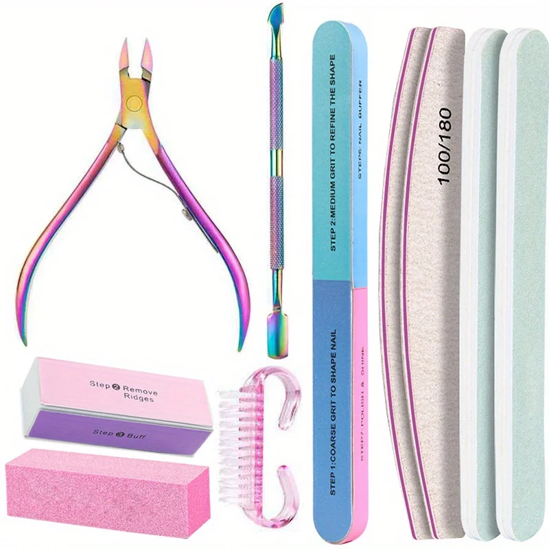 10Pcs/lot Nail Art 100/180 Grit Professional Files Buffer Sponge Block Brush Nail Scissors Kit With Cuticle Nipper Pushers Manic