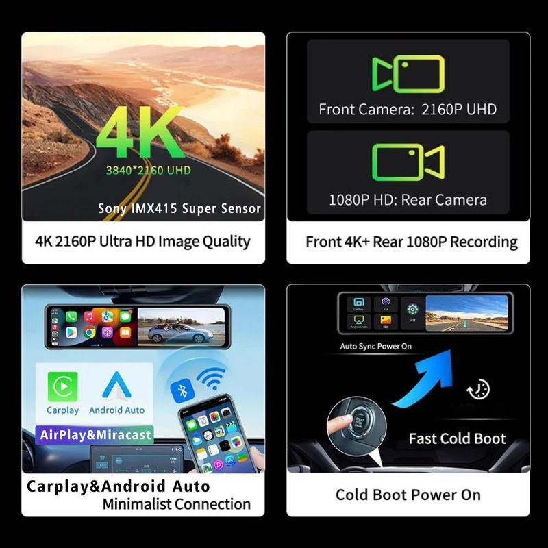 11.26" 4K 2160P Car Dvr Carplay Android Auto Dash Cam GPS WIFI BT FM Stream Rear View Mirror Dashcam Dvrs Camera Drive Recorder
