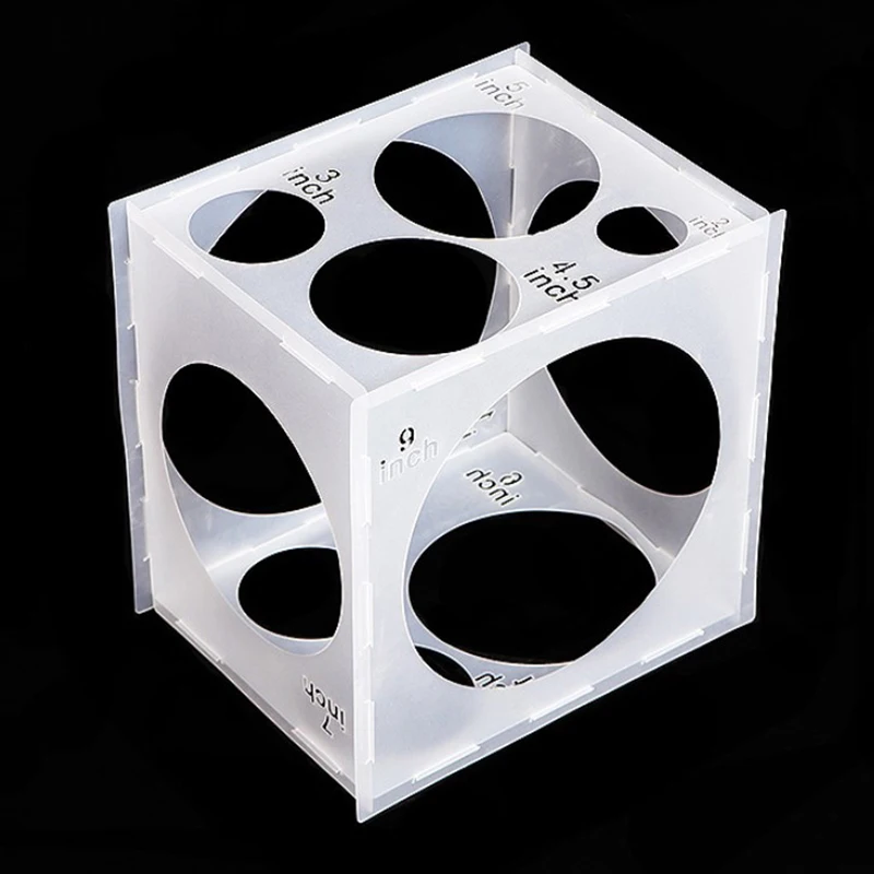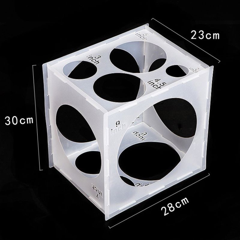 3.11 Holes: the collapsible balloon size box can help you measure different sizes of balloons, including 10 inch/ 25.4 cm, 9 inch/ 23 cm, 8 inch/ 20.3 cm, 7 inch/ 18 cm, 6 inch/ 15 cm, 5 inch/ 13 cm, 4.5 inch/ 11.5 cm, 4 inch/ 10 cm, 3.5 inch/ 9 cm, 3 inch/ 7.6 cm, 2 inch/ 5 cm