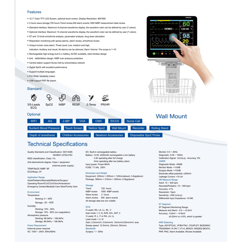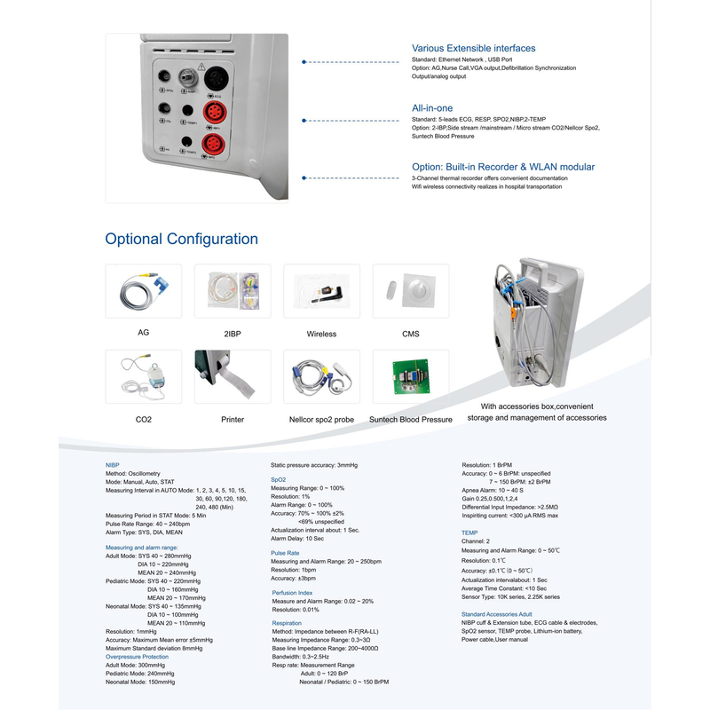 Optional pay:  Nellcor SpO2, EtCO2, IBP,TEMP-2, Thermal Recorder, Wall Mount,Trolly,Central station, Touch Screen. VGA-HDMI