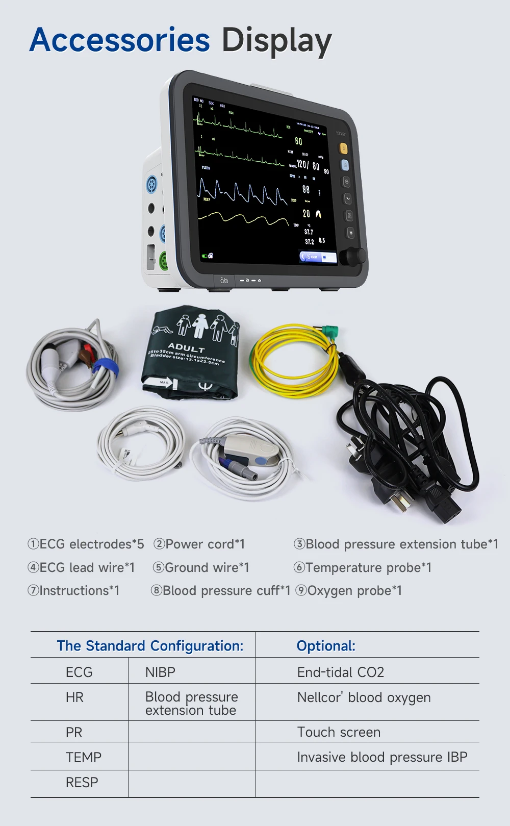 Standard configuration: SpO2, PR, NIBP, ECG, RESP, TEMP
