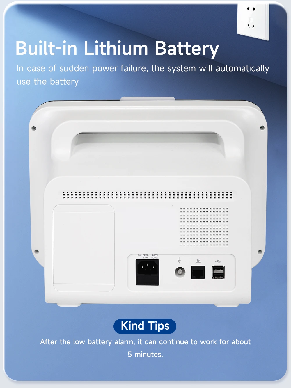 Optional Configuration: SpO2, 2-IBP, ETCO2, Touch screen, Built-in Thermal Printer
