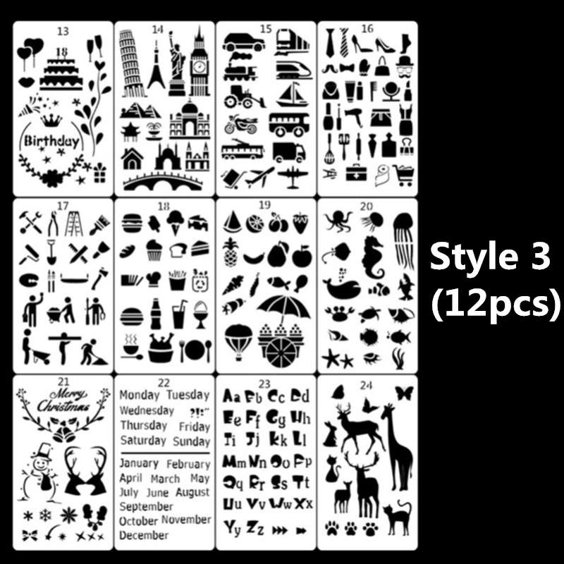 12pcs Pack journal stencils all have different design , it include all the popular patterns and stimulate your creativity , 12pcs different Templates rich your life