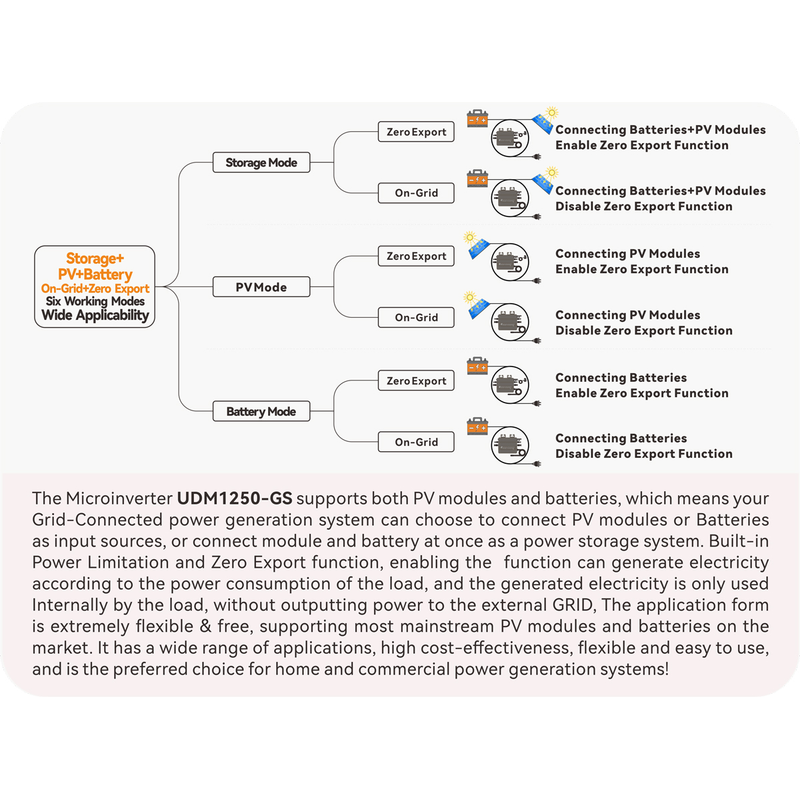 PV Grid-Tied Mode: Pure solar power generation (800W/1000W/1250W max output, model-dependent).