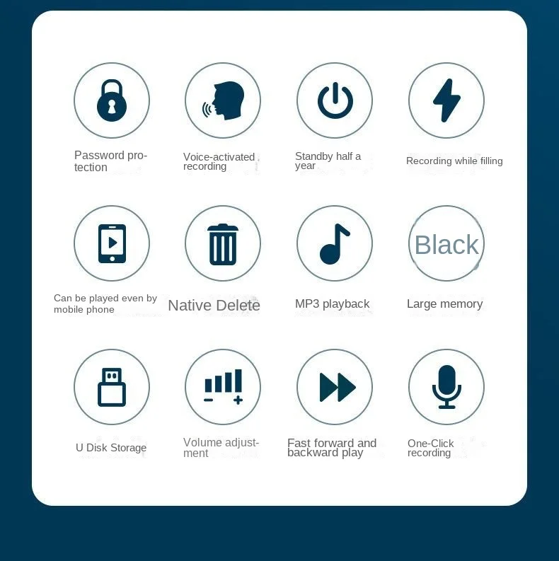 Recording Power: 4.8ma-12ma, supports voice-activated recording, scheduled recording, recording monitoring, password protection, low power saving mode, and shutdown options