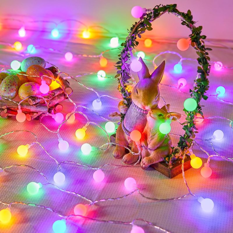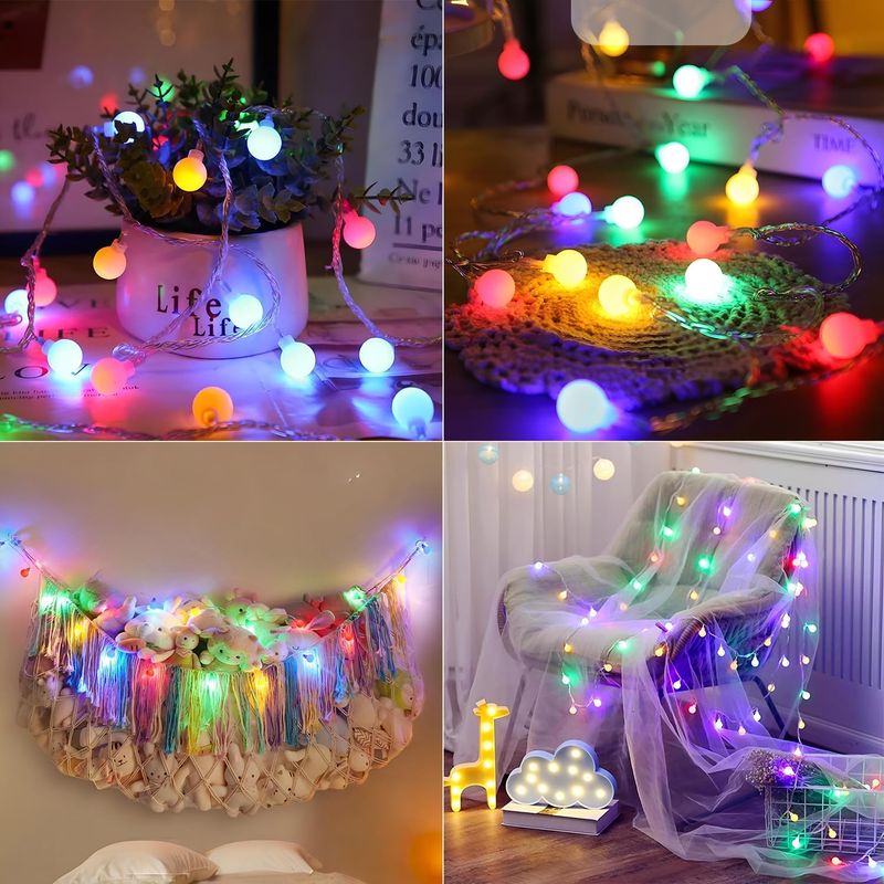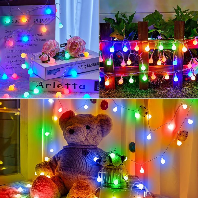 33 FT 100 LED Globe String Lights: Crafted from premium PC plastic and flexible wire, each string lights indoor are 33 feet with 100 LEDs. The globe fairy string lights have four colors: yellow, red, blue and green, and each globe measuring 0.69 inches in diameter. The colorful lighting helps to create a joyful and festive atmosphere for you.