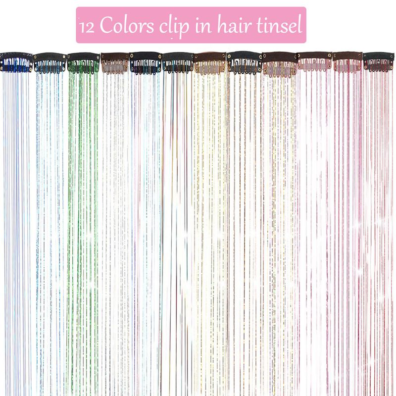 12Pcs Hair Tinsel Clip In 19.7" Glitter Tinsel Hair Extensions Synthetic Clip In Sparkle Hair Accessories For Kids Girls Women