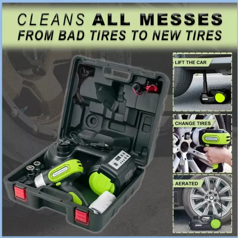 1.The Vehicle Repairing Kit Including: Electric Jack, Electric Wrench, two Sockets, a pair of Gloves, Extension Cord with Battery Clamp, Car Charger, and a sturdy Storage Case.