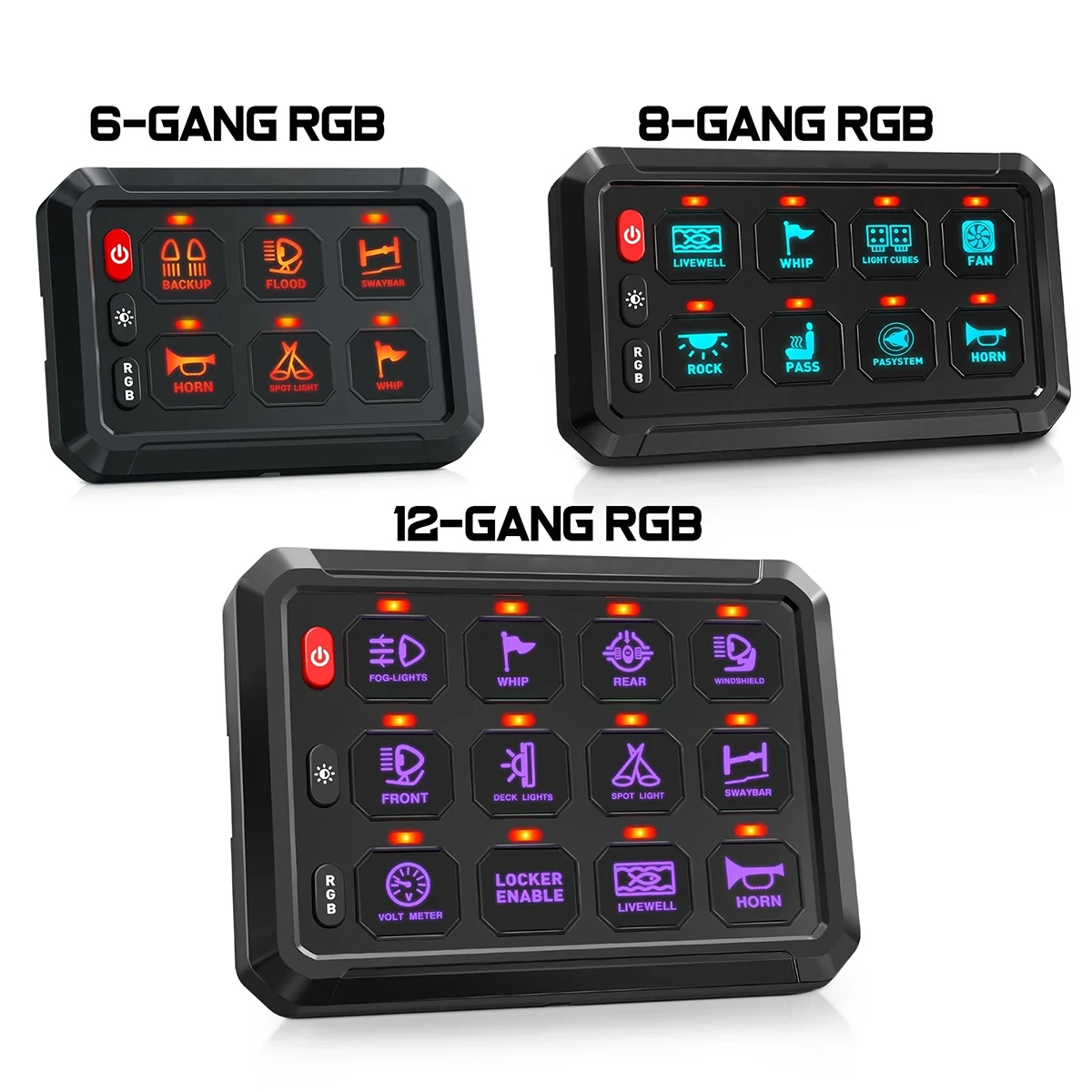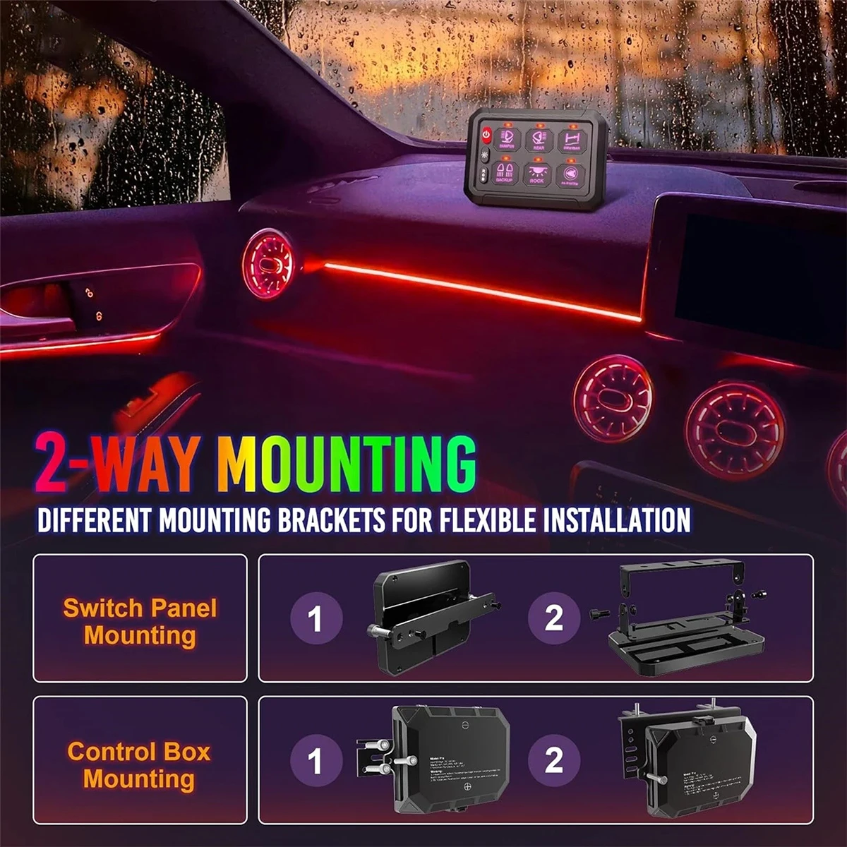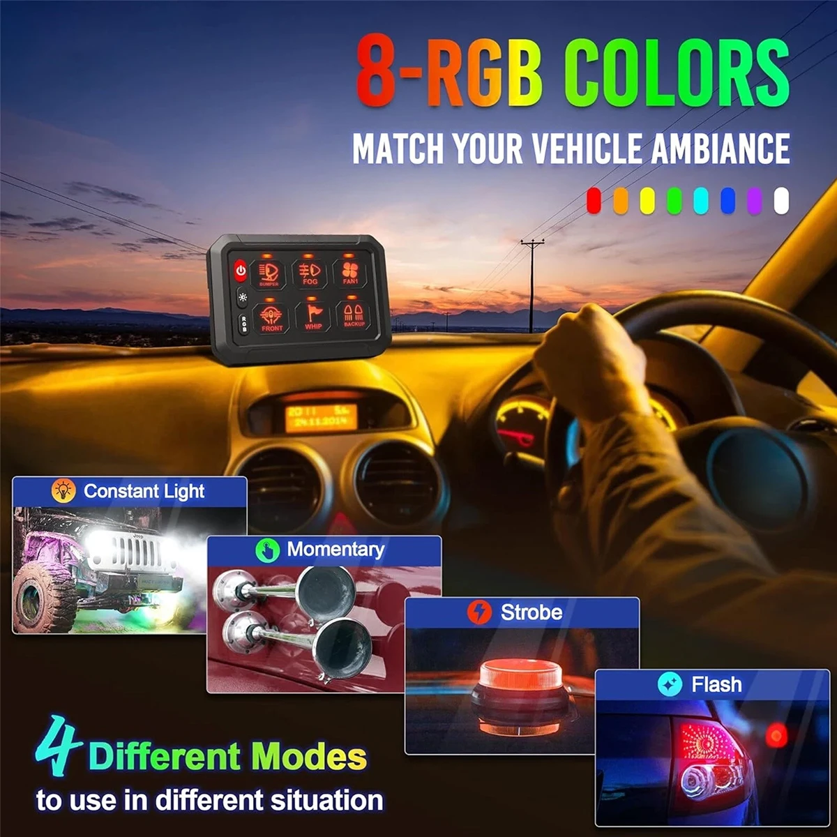 Upgraded 4 Control Modes - This upgraded multifunction switch panel has 4 modes: 1.Toggle (Red Lamp), Constant Light mode; 2.Momentary ignition power (Blue Lamp) , press and hold to turn on, release to turn off; 3.Flash Light Mode (Purple Lamp), flashing at a lower speed which can be used for turn signal; 4.Strobe Mode(Green Lamp), used for emergency light or warning light. You can easily switch between modes in different situation