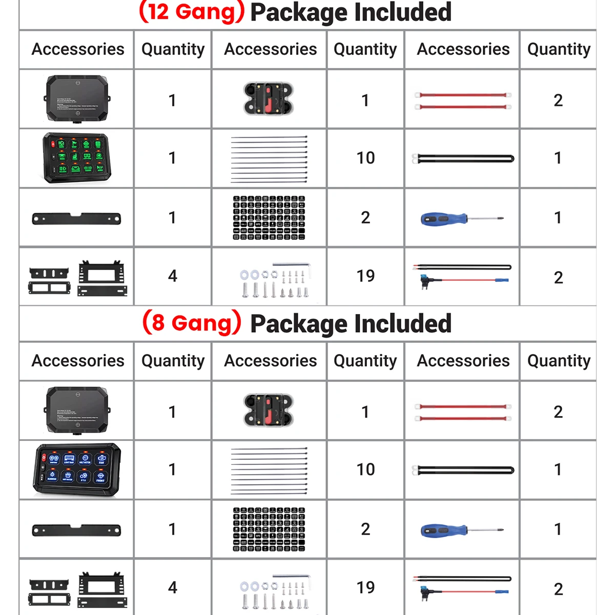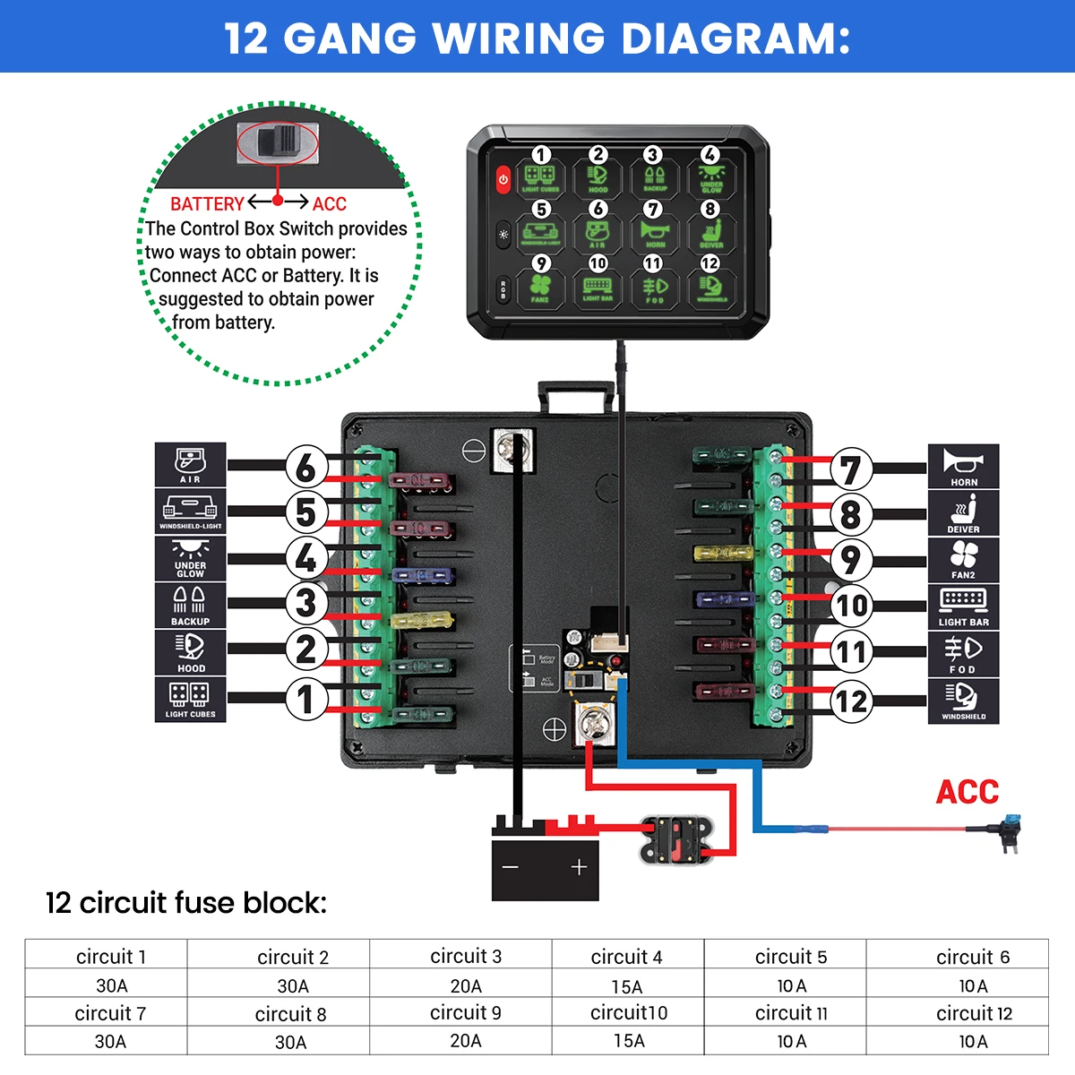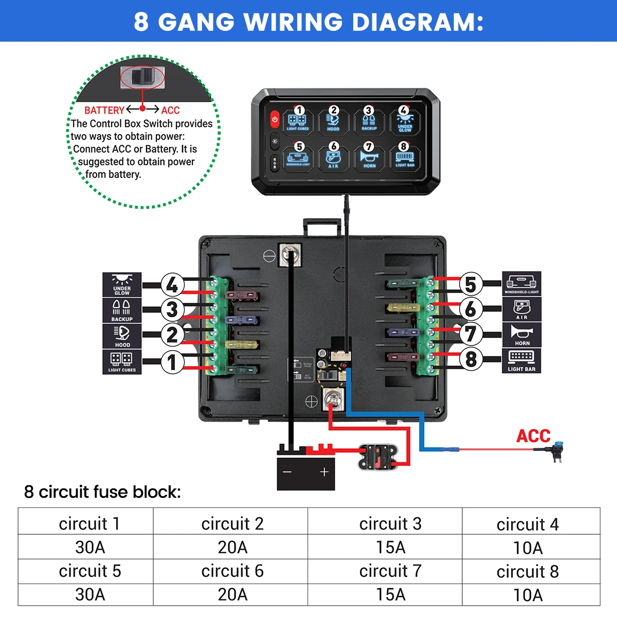 Two ways for Power Source - The control box switch provides two ways to obtain power: connect ACC or Battery. Different mounting brackets for flexible and quick installation. Bonus 140pcs labeling stickers included to customize your switch panel buttons. And fuse to well protect your car circuit