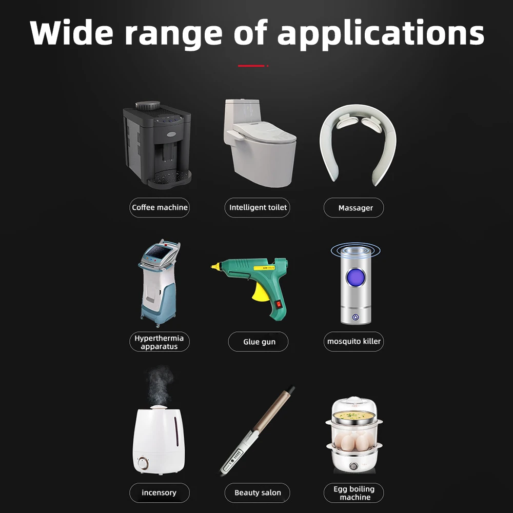 5. Application range: coffee machine, smart toilet, massager, hyperthermia instrument, glue gun, mosquito killer, incense burner, beauty salon, egg cooker