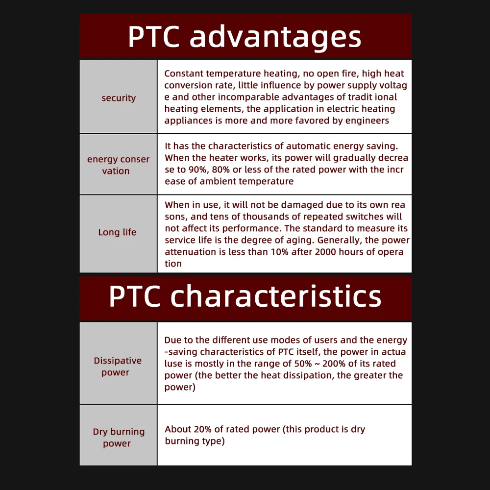 4. The reaction is rapid. After power-on, PTC will quickly convert electrical energy into heat energy and conduct it to the surface of the aluminum shell within 10S, which can be dry-burned for a long time.