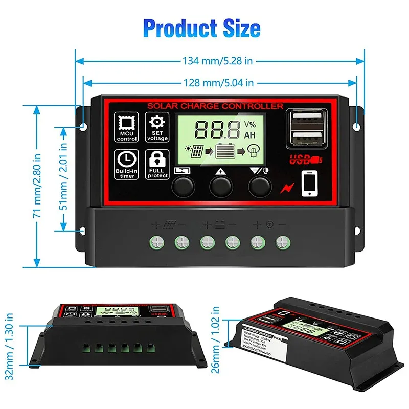 12V/24V10A-100A Solar Charge Controller LCD Display Dual MOS PWM Control Solar Charge Controller Solar Panel Battery Regulator
