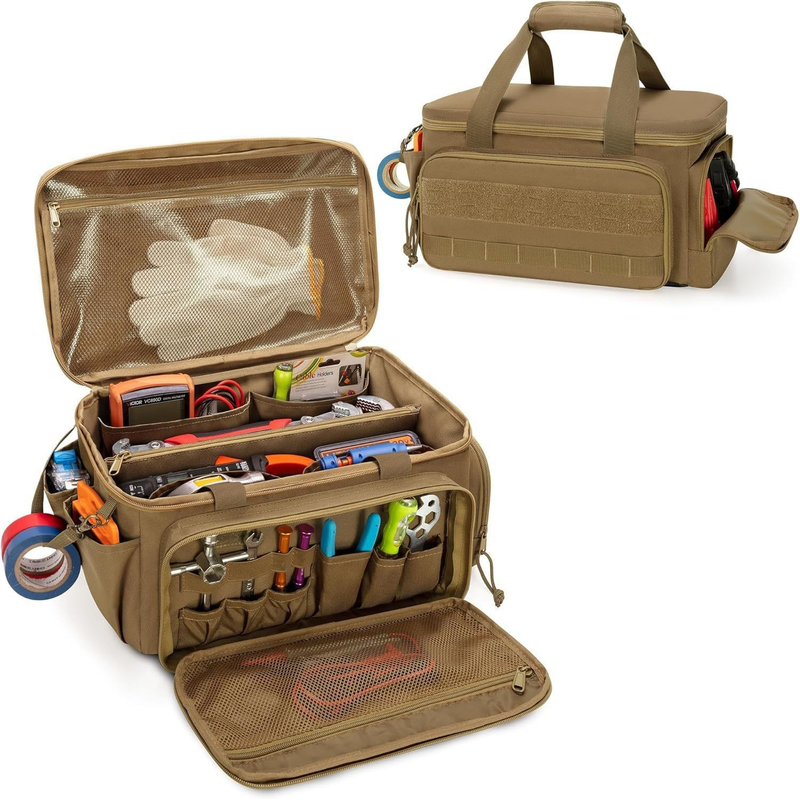 Thoughtful design: The padded handle reduces hand pressure, and the large opening and dual-way zipper facilitate easy access to tools. With a tactical style and innovative creativity, this hand tool storage bag is widely used in industry, home decoration, outdoor maintenance, and more. It solves the problem of messy storage and allows for clear and easy classification of tools at a glance. It is suitable for repair technicians, electricians, carpenters, and handymen.